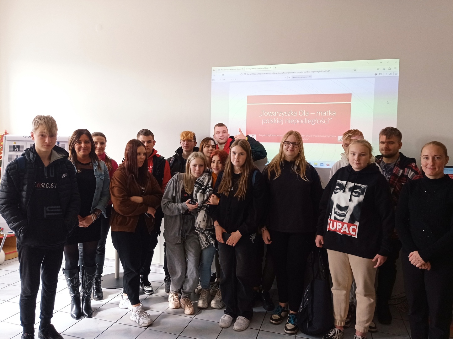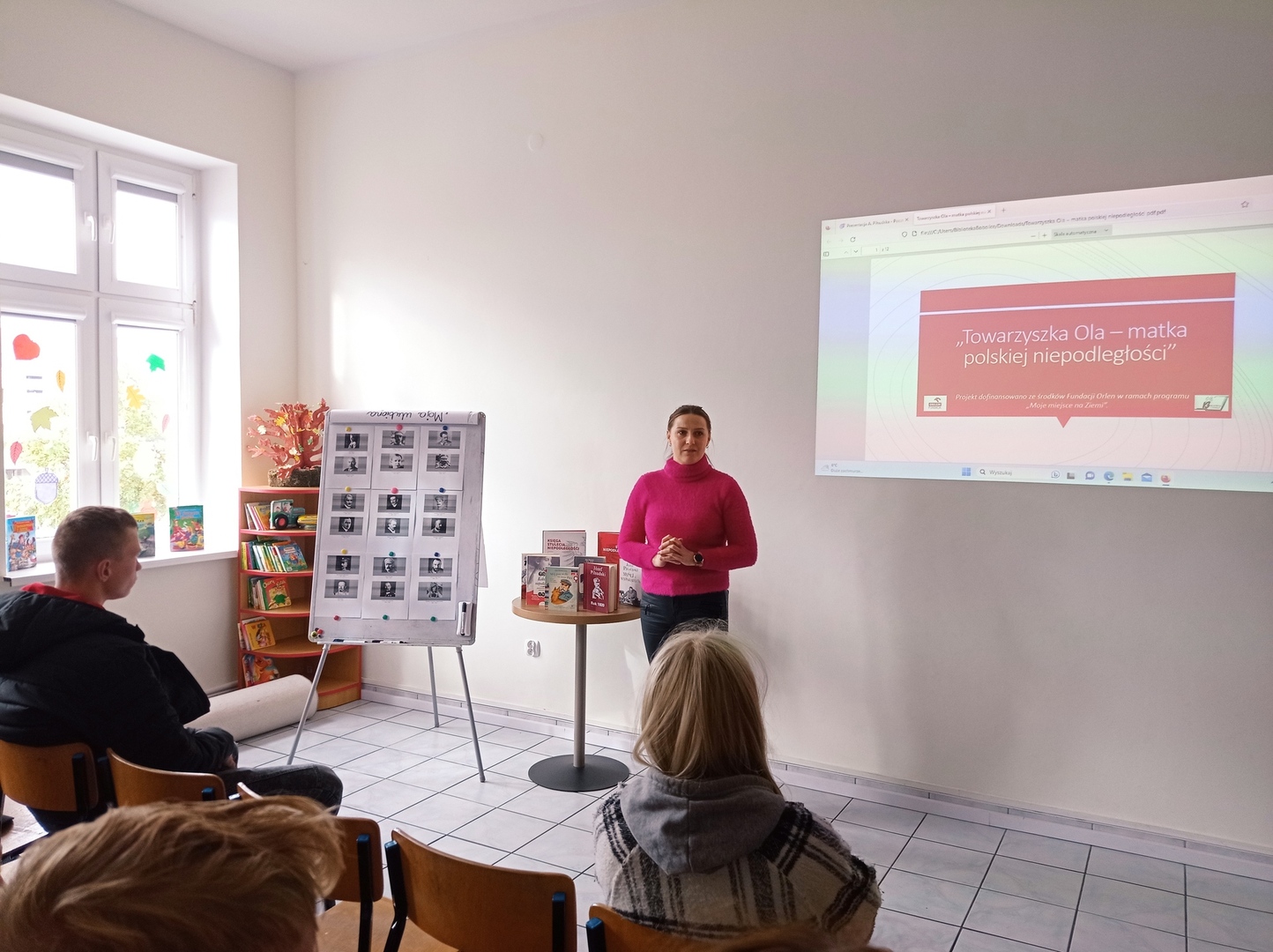 W dniu 18.10.2023 roku rozpoczęliśmy lekcje biblioteczne o historii Aleksandry Piłsudskiej i drodze Polski do odzyskania Niepodległości. Jako pierwsi odwiedzili nas uczniowie branżowej szkoły NAUTA w Bobolicach. Po wysłuchaniu najważniejszych faktów i ciekawostek słuchacze odpowiedzieli na kilka pytań do prezentacji. Spotkanie było również okazją, aby zaprosić młodzież do czynnego udziału w mobilnej grze terenowej 11 listopada oraz Gminnym Konkursie wiedzy o życiu i dokonaniach A. Piłsudskiej realizowanego w ramach projektu pn. „Towarzyszka Ola – matka polskiej niepodległości” dofinansowanego ze środków Fundacji Orlen z programu „Moje miejsce na Ziemi”.