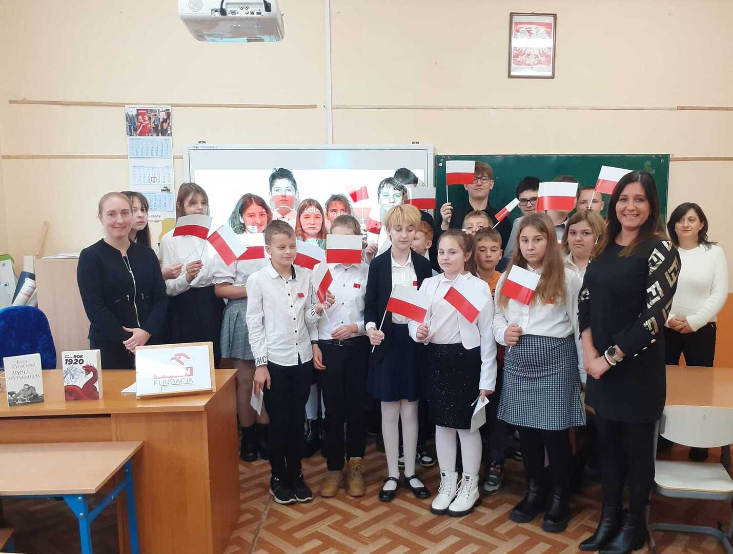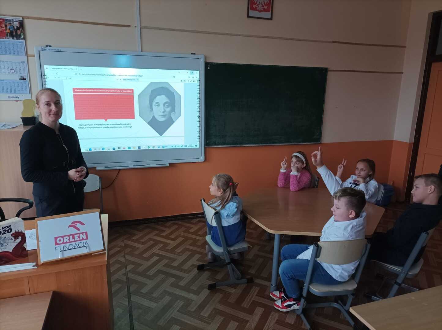 Prezentacja pn. "Towarzyszka Ola - matka polskiej niepodległości" wyświetlona została wczoraj dla uczniów Szkoły Podstawowej w Drzewianach. Uczniom została zaprezentowana postać Patronki Roku 2023 - Aleksandry Piłsudskiej i jej zasługi w walce o niepodległość. Młodsze klasy na zakończenie spotkania kolorowały symbole narodowe wg wzoru oraz rozwiązywały labirynt niepodległościowy. Dziękujemy za owocne spotkanie.