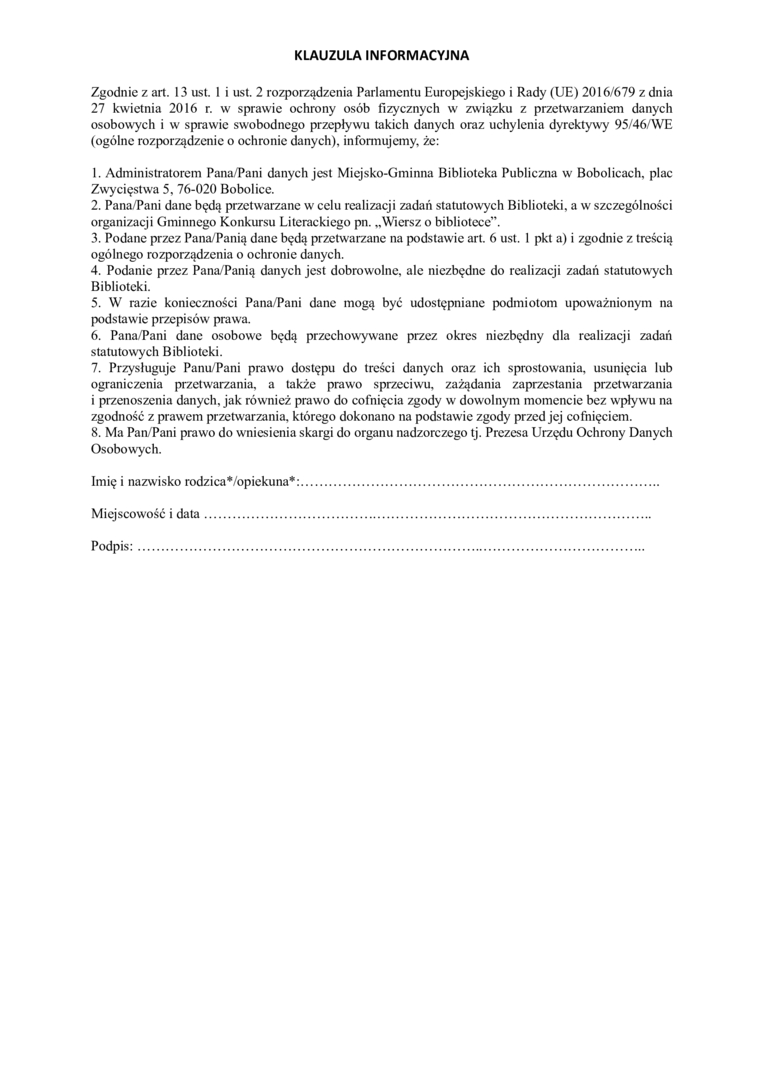 2. Gminnym Konkursie Literackim pn. „Wiersz o bibliotece”, który skierowany jest do mieszkańców Gminy Bobolice i odbędzie się w 2 kategoriach wiekowych: