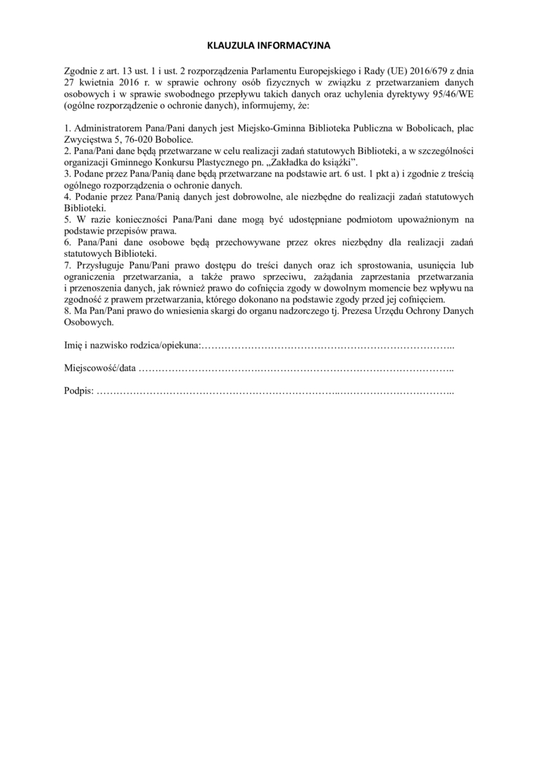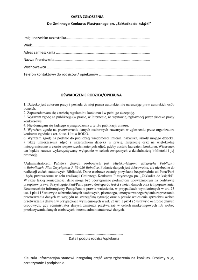 1. Gminnym Konkursie Plastycznym pn. „Zakładka do książki”, który skierowany jest do dzieci w wieku przedszkolnym z terenu Gminy Bobolice oraz