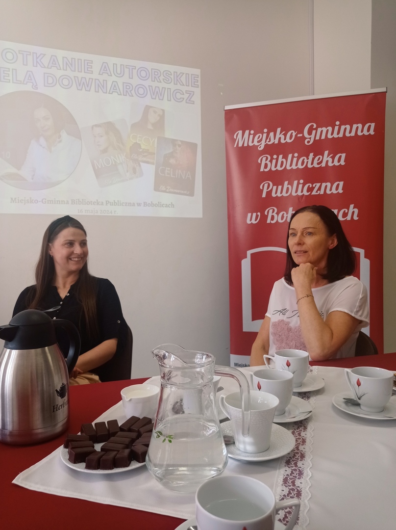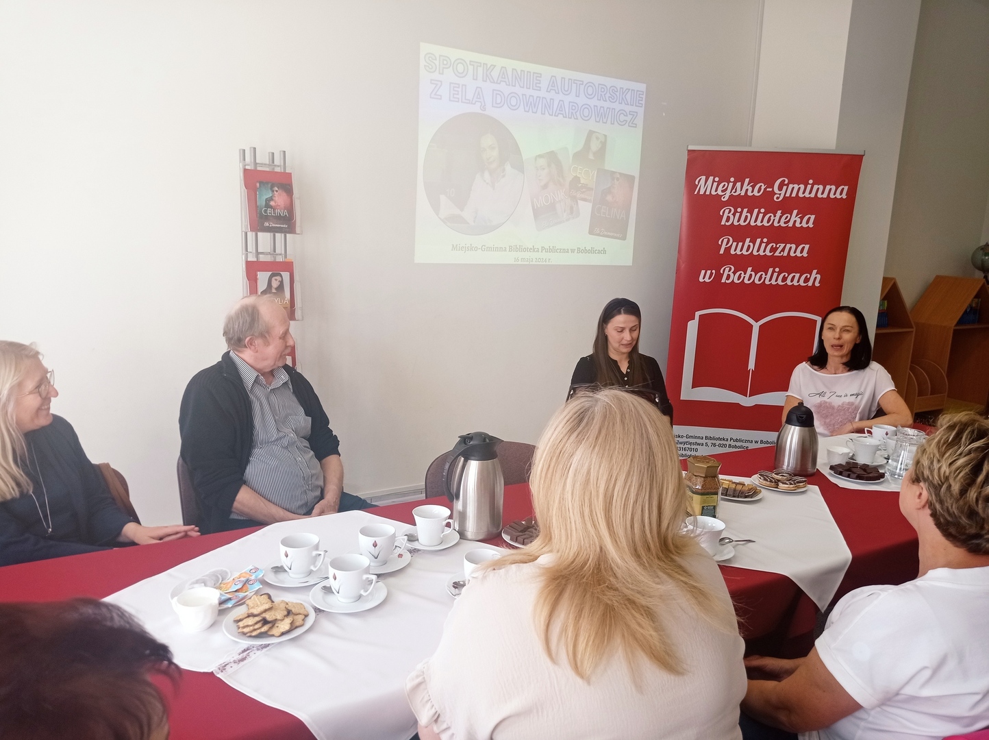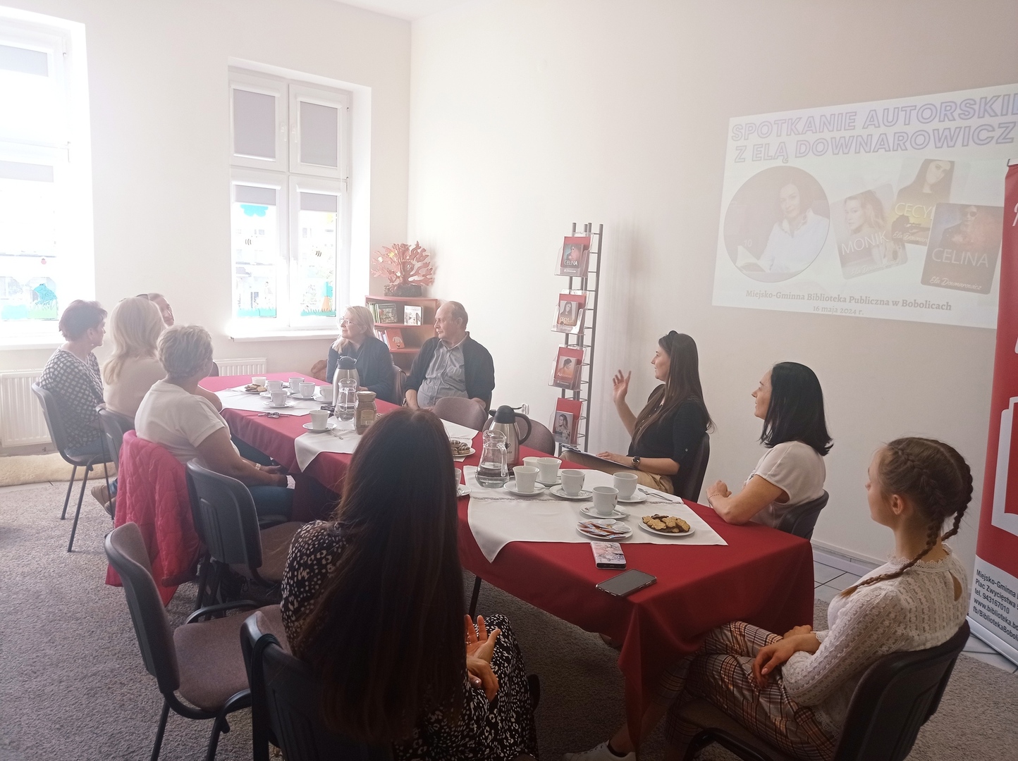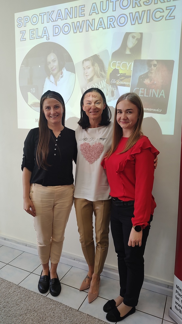 W czwartkowe popołudnie w naszej Bibliotece odbyło się spotkanie autorskie z kobietą wielu talentów, scenarzystką, reżyserką musicali, felietonistką, a w szczególności pisarką Elą Downarowicz. Pani Ela do tej pory wydała pięć książek, w których głównymi bohaterkami są kobiety zmagające się z różnymi problemami życia codziennego. W książkach pisarki poruszane są bardzo trudne tematy tj. depresja, zdrada czy przemoc domowa. Jak sama mówi, „lubi wzbudzać w czytelnikach skrajne emocje, pobudzać do myślenia i zadumy nad otaczającym nas światem.”