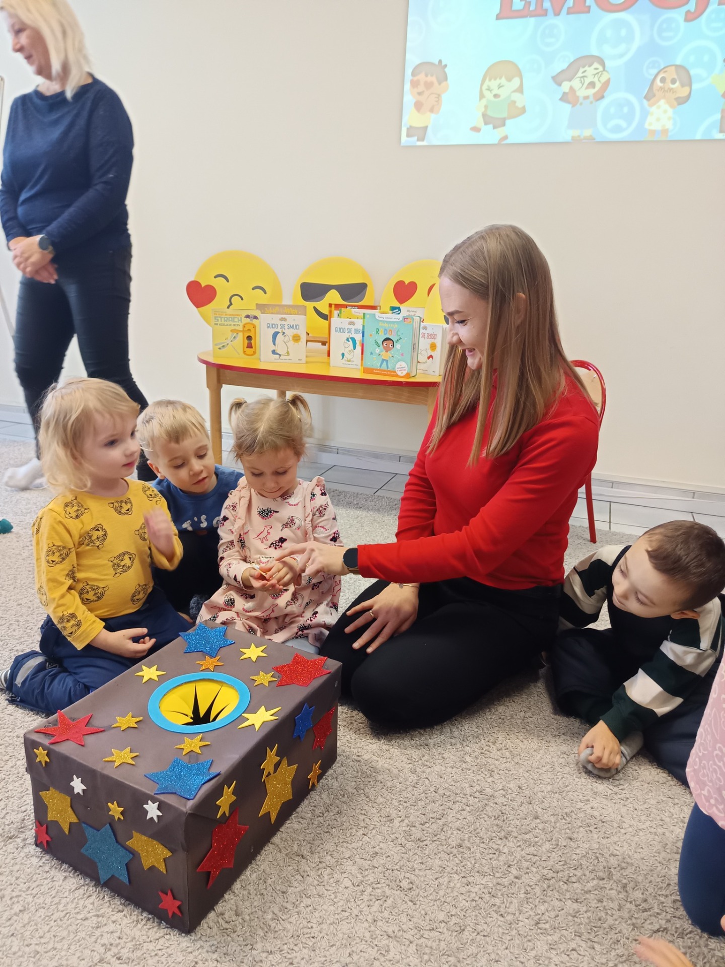 Przedszkolaki wysłuchały opowiadania "Kiedy czuję radość" z serii Akademia Mądrego Dziecka, następnie próbowały nazwać wylosowane z magicznego pudełka emocje. Kolejnym elementem spotkania była podróż do Krainy Radości