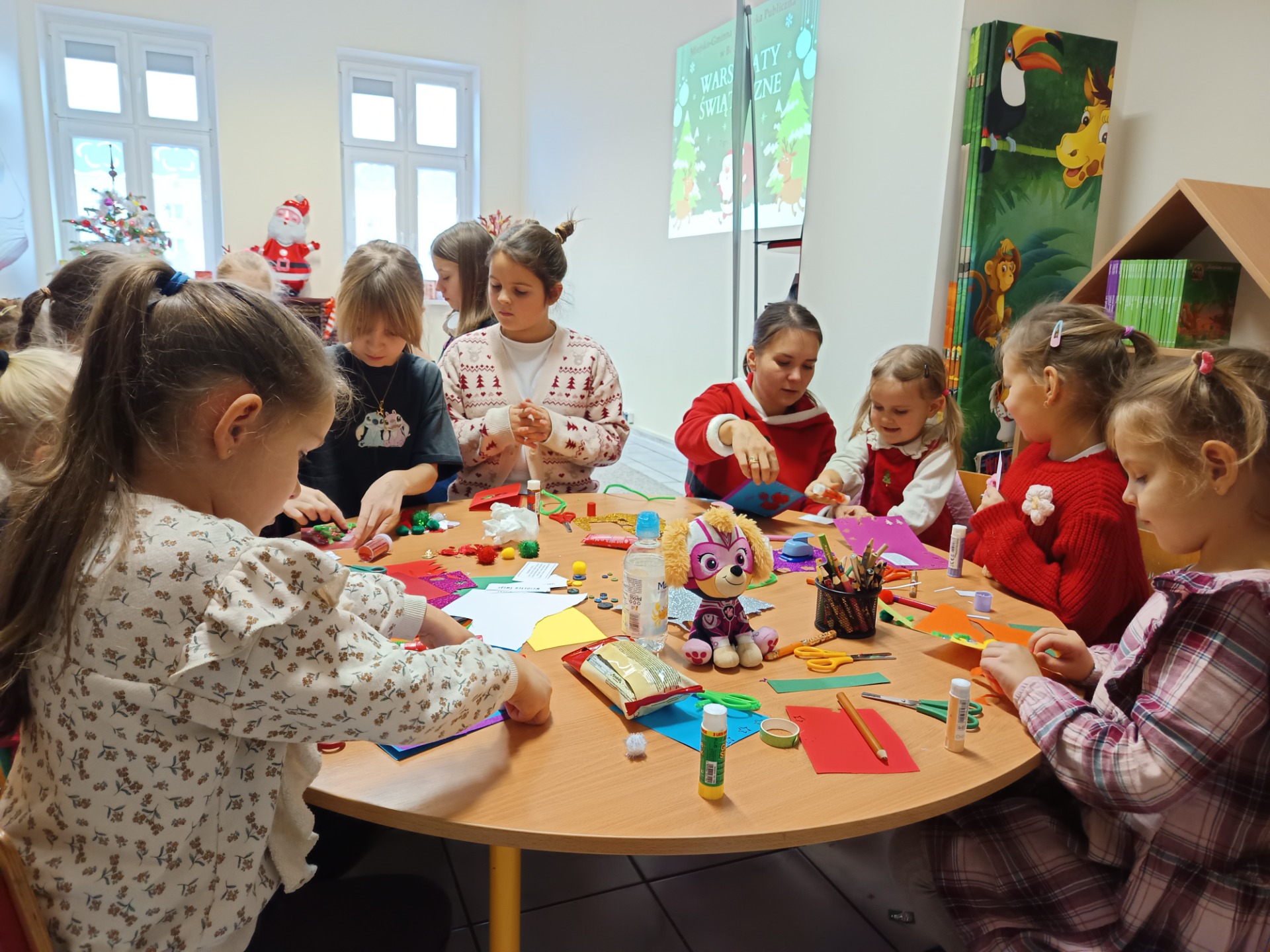 Po wysłuchaniu opowieści oraz rozmowie, dzieci uczestniczyły w zabawach integracyjnych, muzycznych i edukacyjnych. Wykonali piękne kartki świąteczne dla najbliższych, a także kartkę świąteczną dla kogoś nam bliskiego, kto otrzyma tę kartkę zrobioną przez najmłodszych czytelników