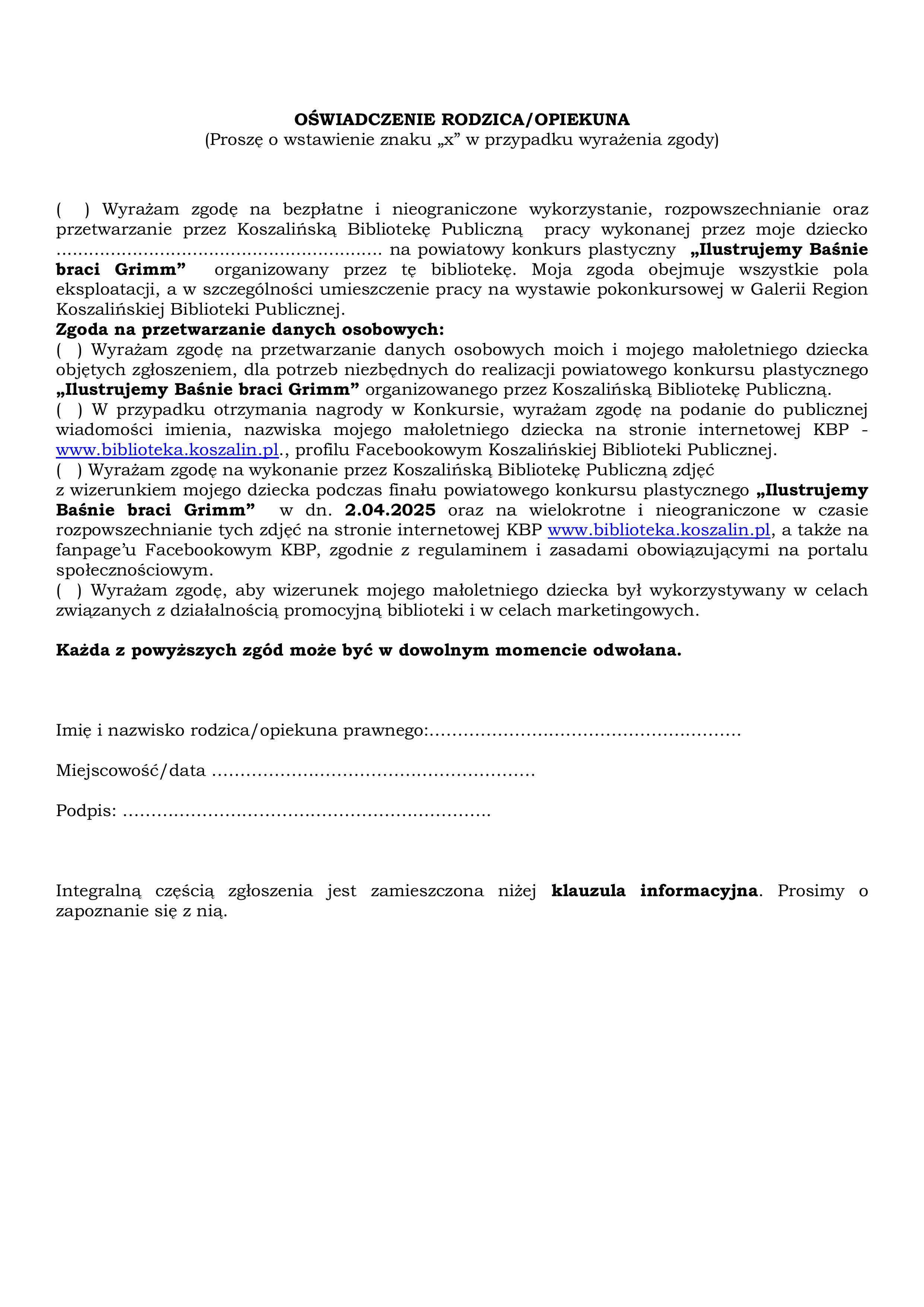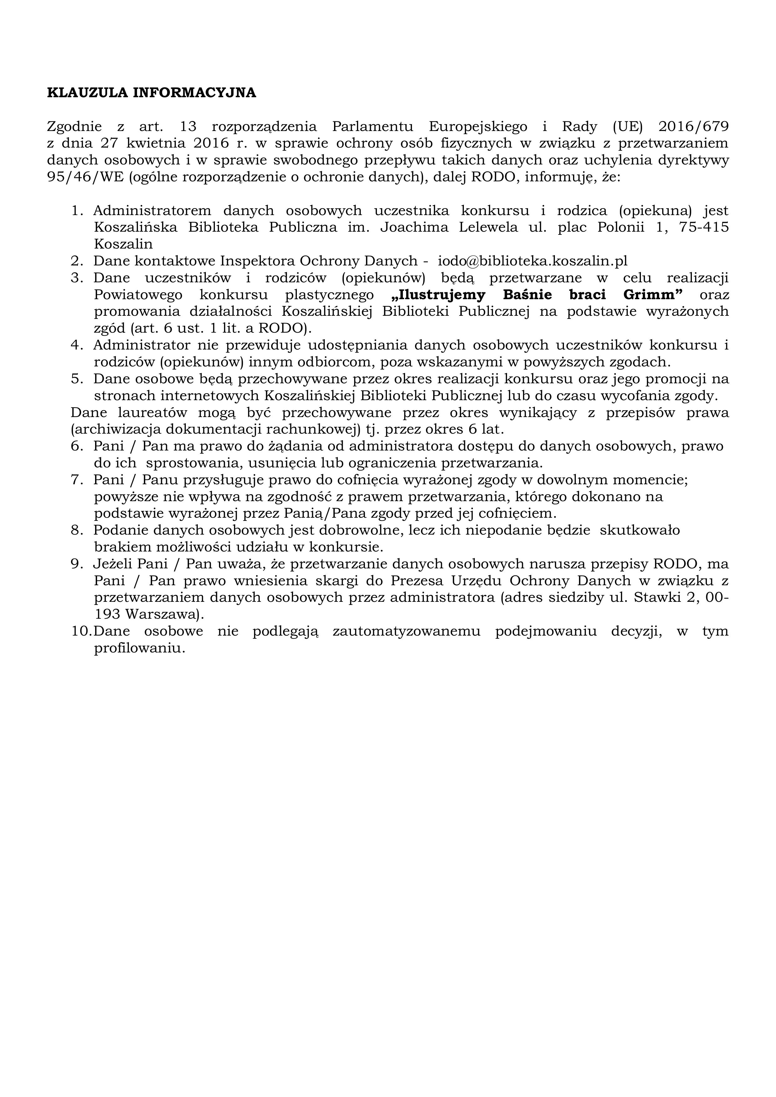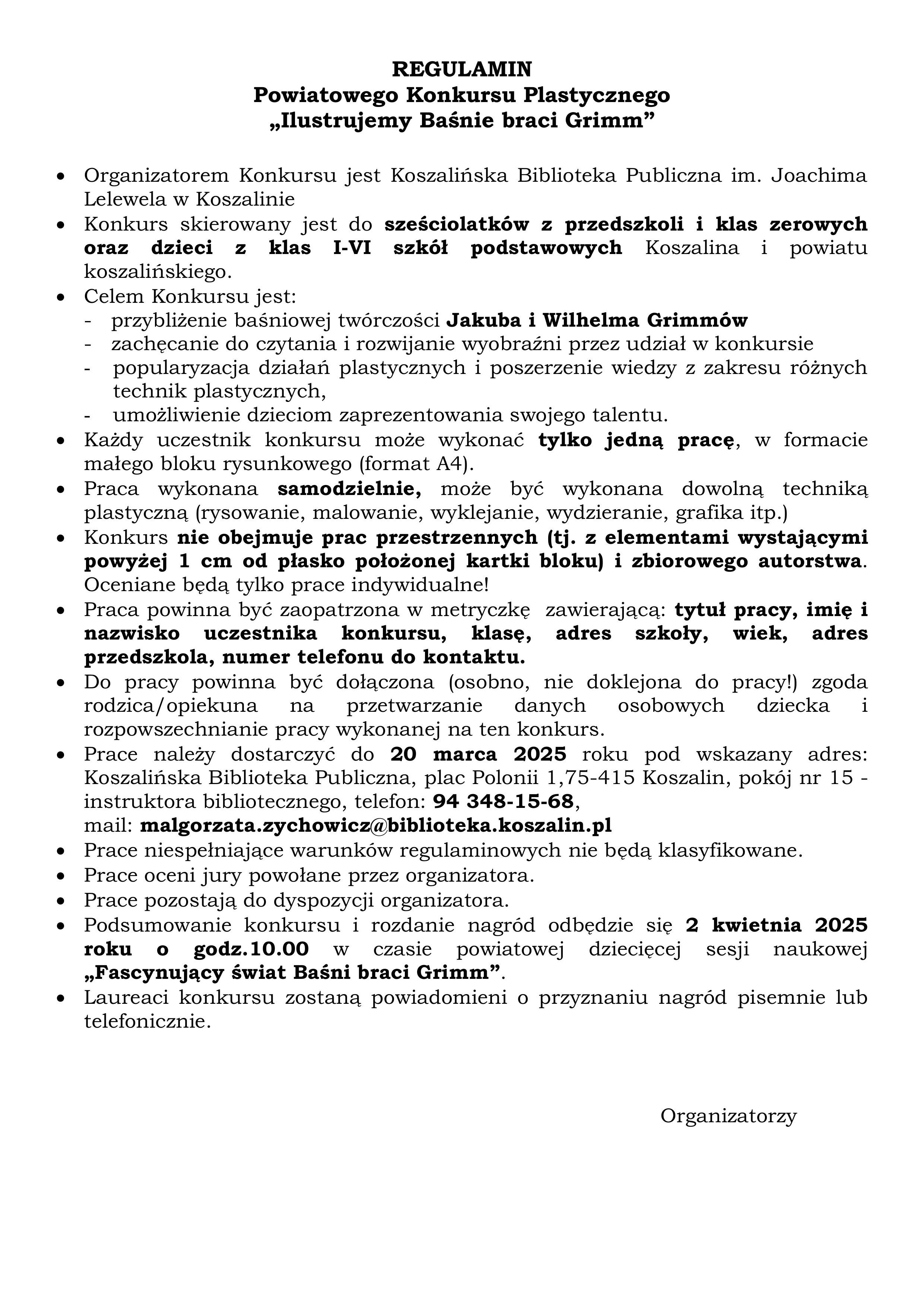 Wspólnie z Koszalińską Biblioteką Publiczną zapraszamy do udziału w powiatowym konkursie plastycznym pt. "Ilustrujemy Baśnie braci Grimm" skierowanym do sześciolatków i uczniów klas I-VI szkoły podstawowej Koszalina i powiatu koszalińskiego. W załączniku regulamin konkursu wraz z kartą zgłoszenia.