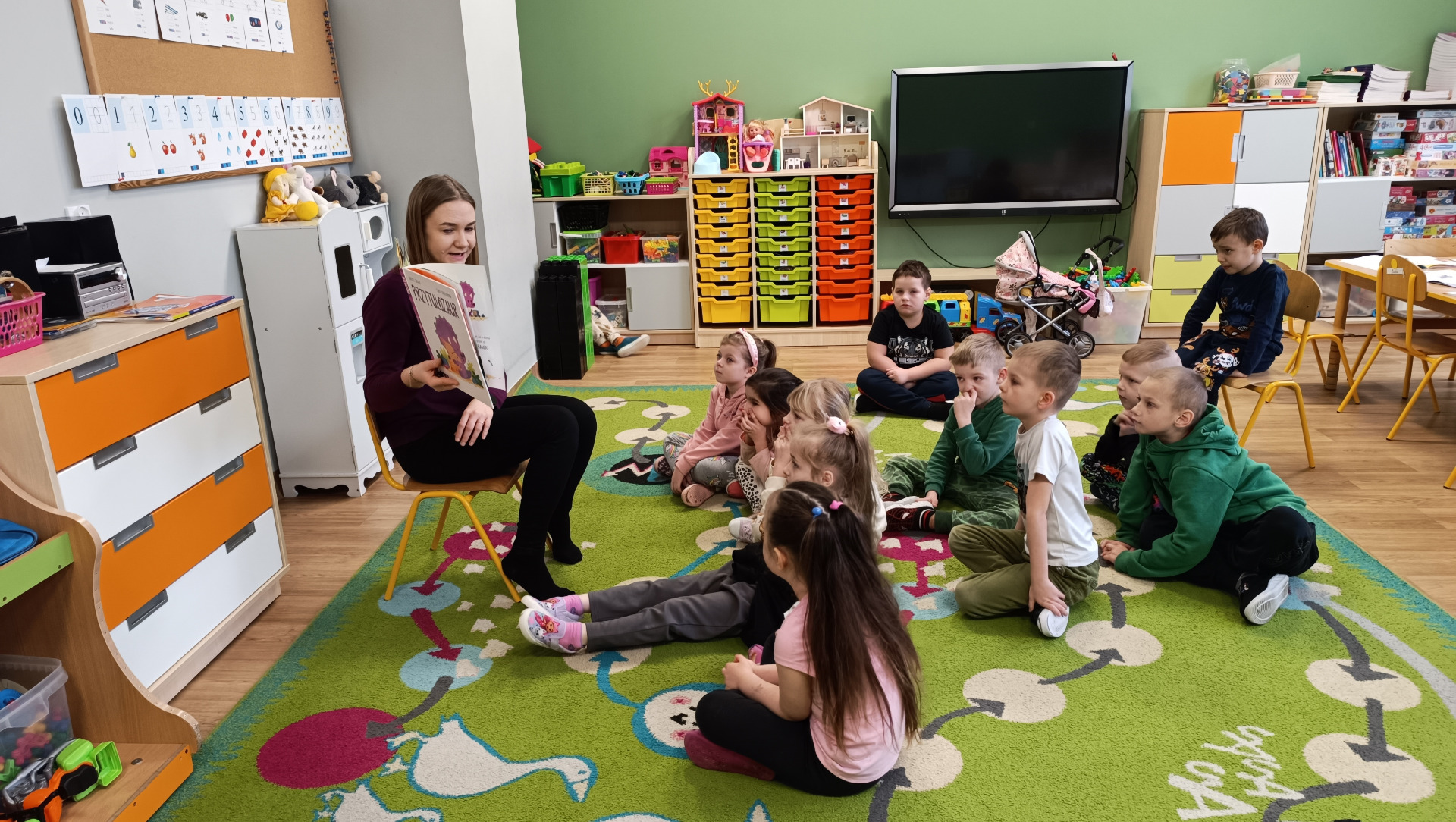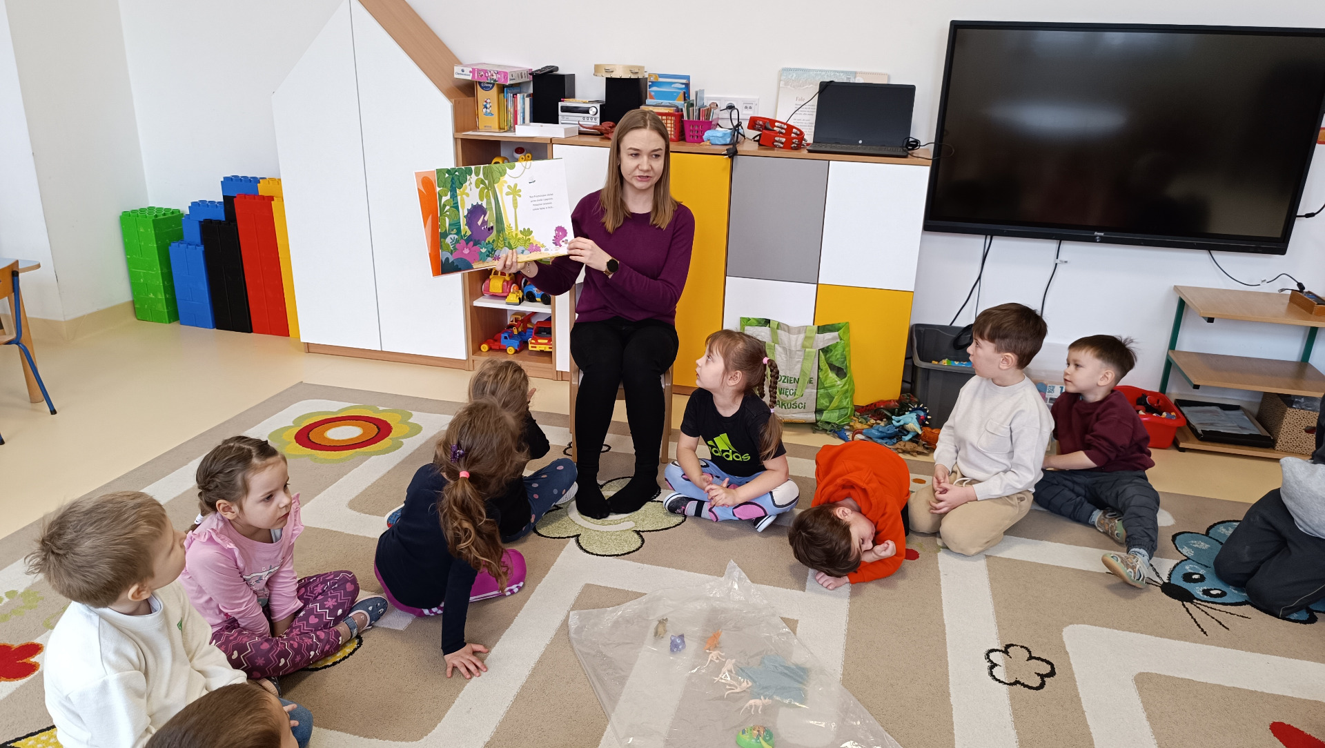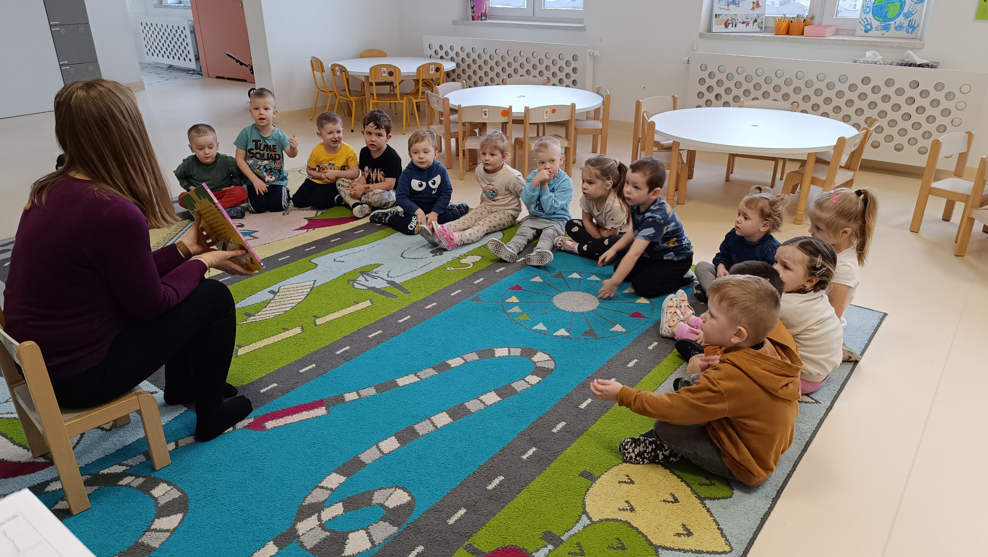 Dzieci z wielkim zainteresowaniem słuchały historii o małym dinozaurze, który pragnie być kochany i akceptowany przez innych. Przy okazji rozmowy o treści książki, maluchy dzieliły się swoimi spostrzeżeniami na temat przyjaźni i znaczenia okazywania uczuć.