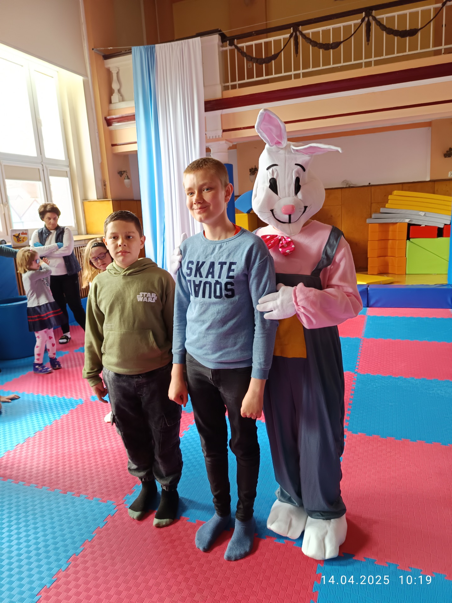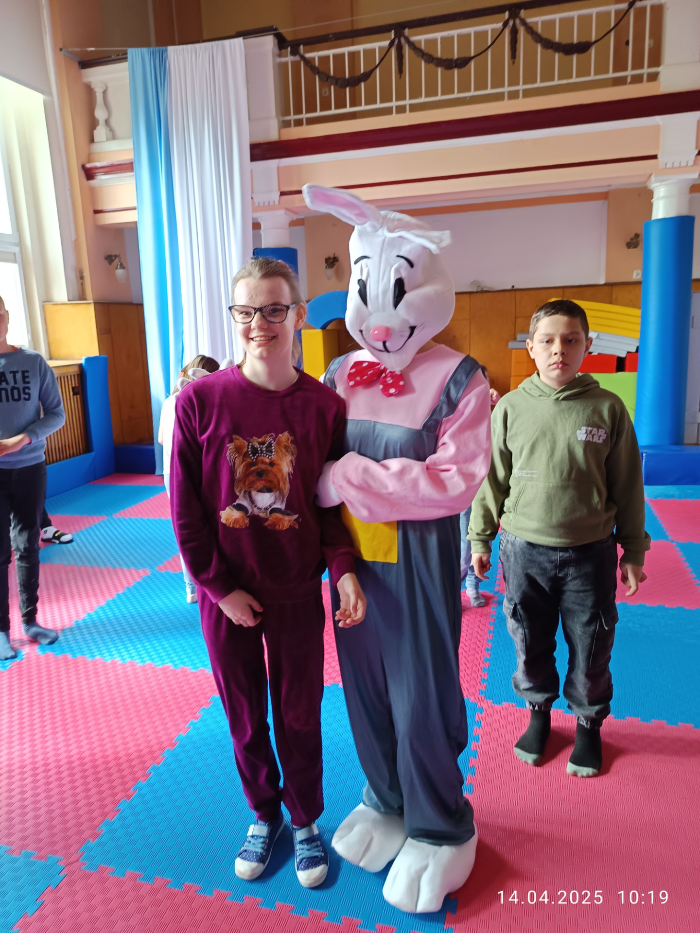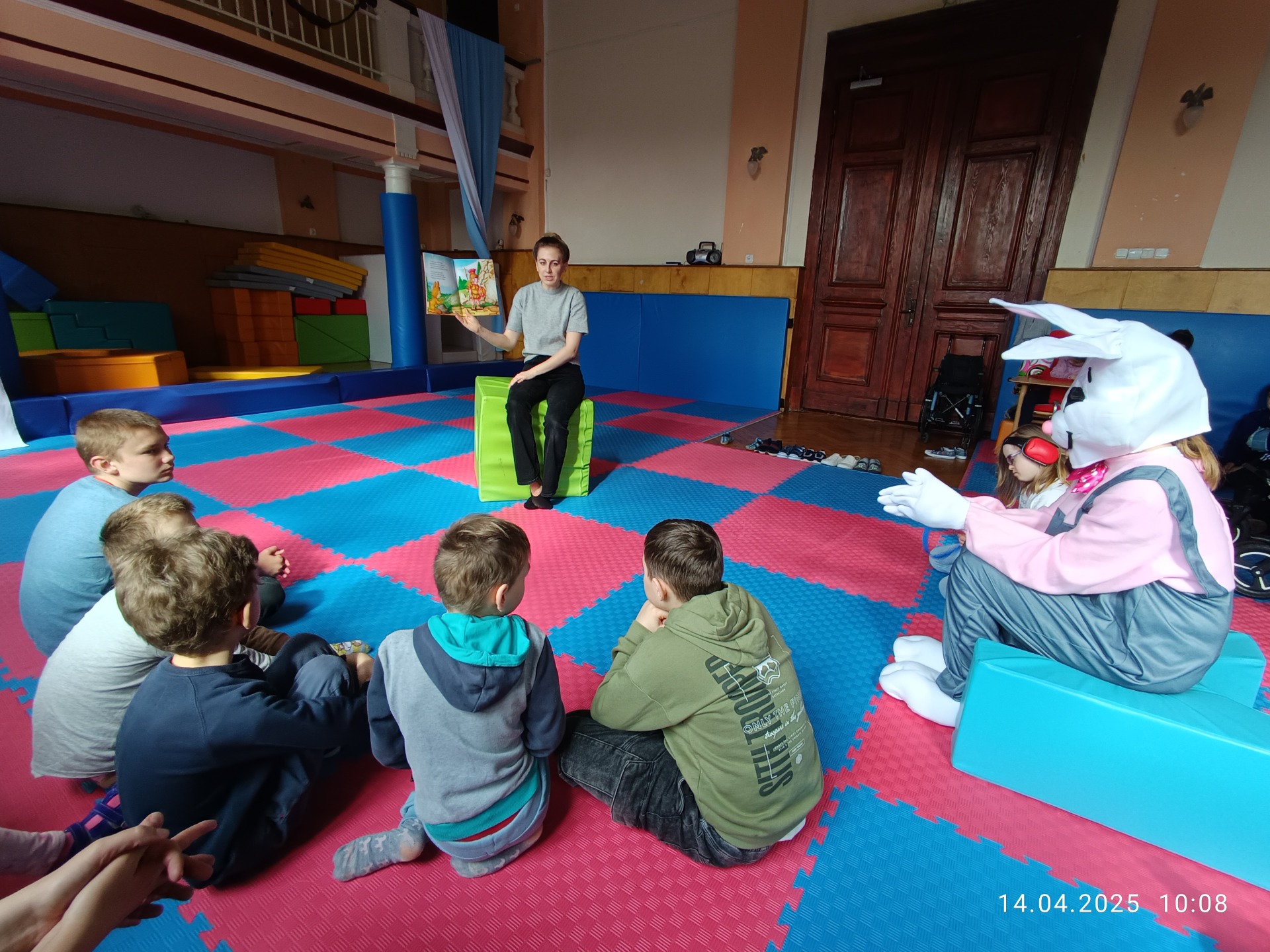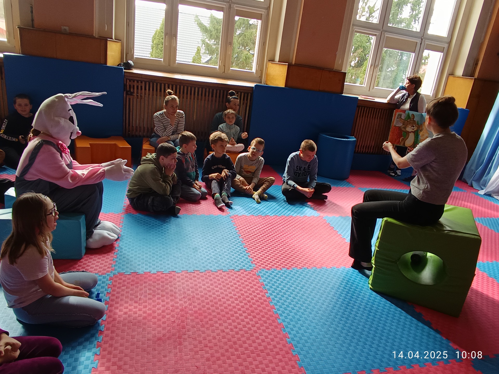 zawitał dzisiaj do podopiecznych OREW Bobolice na zajęcia bajkoterapii. Uczestnicy spotkania wysłuchali bajkę, pt. ,,Zajączek Feliks", która nawiązuje do Świąt Wielkanocnych, a następnie bawili się wspólnie z Zajączkiem
