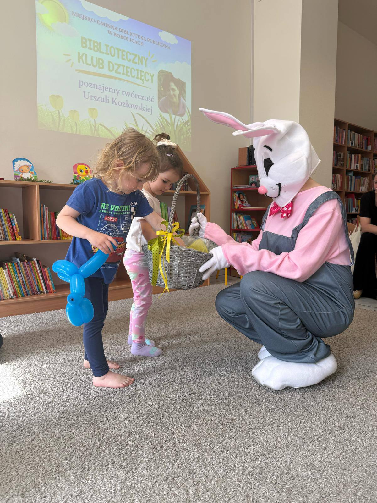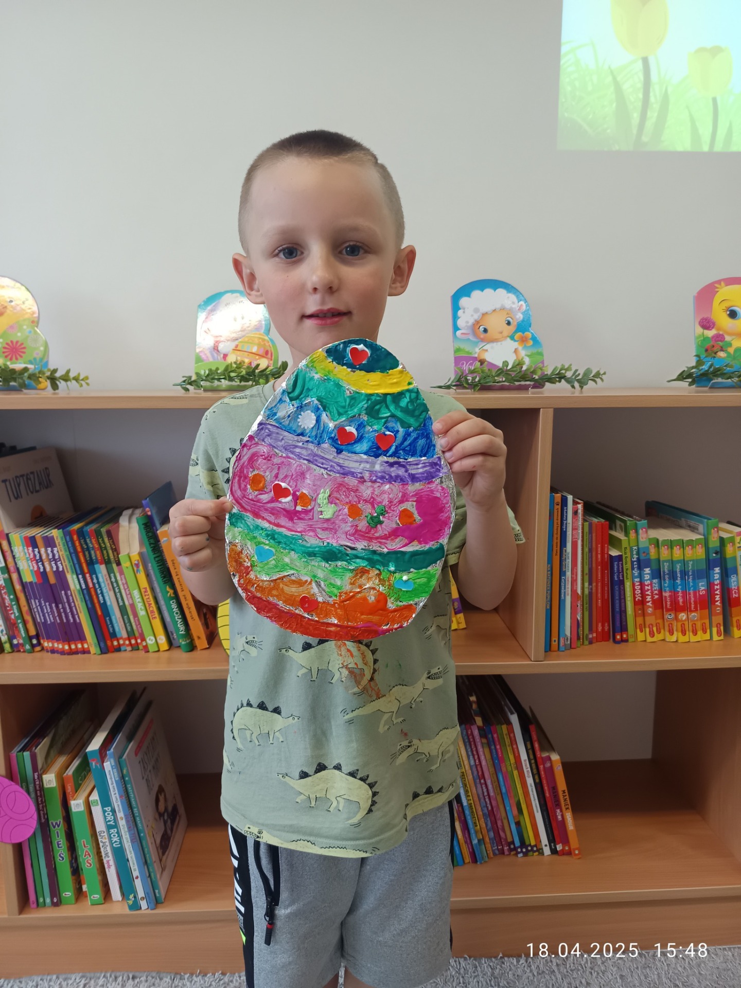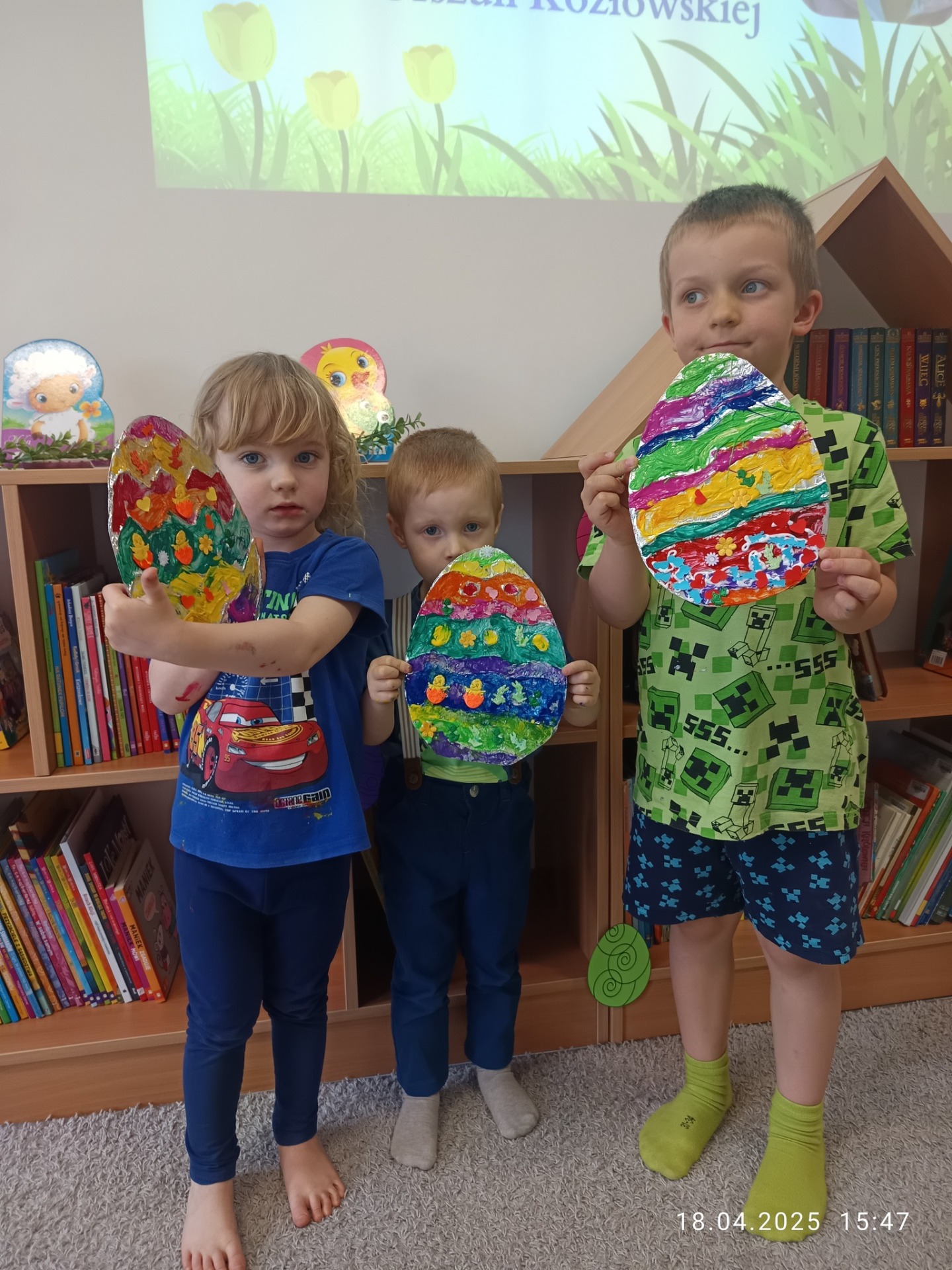 Podczas dzisiejszych przedświątecznych zajęć Bibliotecznego Klubu Dziecięcego uczestnicy wysłuchali kolejnej bajki Urszuli Kozłowskiej, pt. ,,Wielkanocna pisanka". To urocza książeczka, która wprowadza najmłodszych czytelników w nastrój Świat Wielkanocnych. Nie zabrakło spotkania z Zajączkiem Wielkanocnym