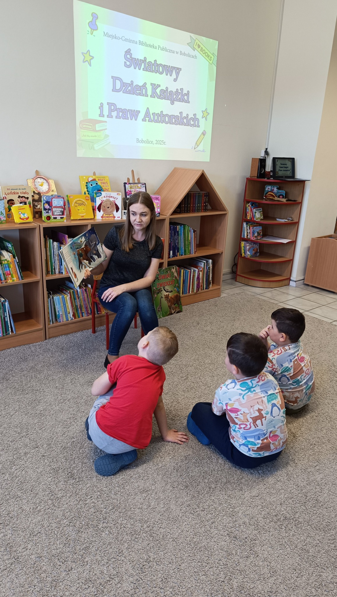 W sobotnie przedpołudnie w naszej bibliotece świętowaliśmy Światowy Dzień Książki i Praw Autorskich. Dzieci wysłuchały opowiadania pt. ,,Kiedy otwierasz książkę" ,wzięły udział w zabawach związanych z literaturą oraz rozmawiały o tym, jak dbać o książki. Każde dziecko przygotowało własną okładkę do swojej ulubionej książki. Było twórczo, radośnie i bardzo inspirująco.
