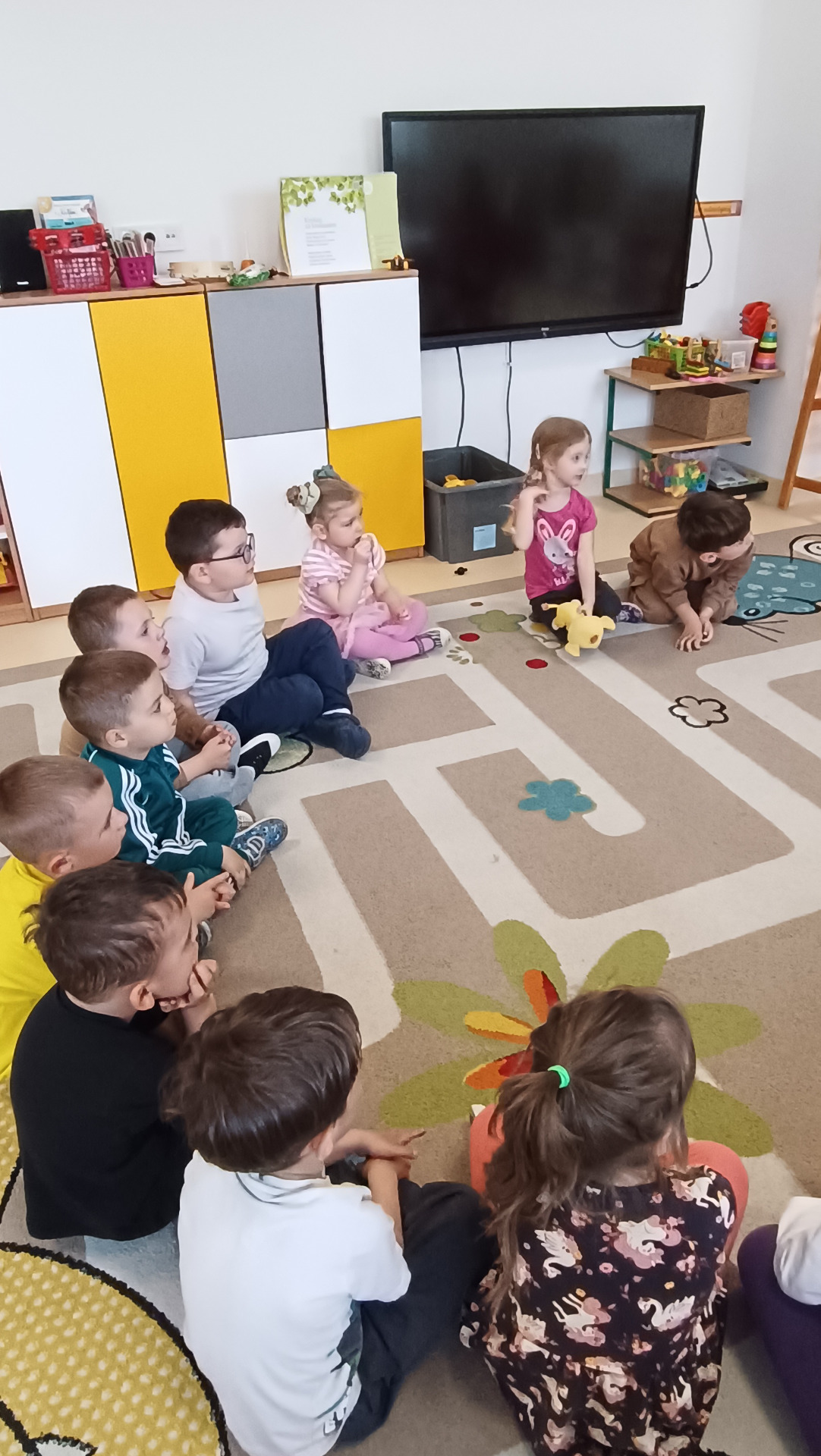 Dziś dzieci wysłuchały opowiadania "Jadzia Pętelka idzie na piknik" i wzięły udział w zabawie ruchowej "Chu chu ua".