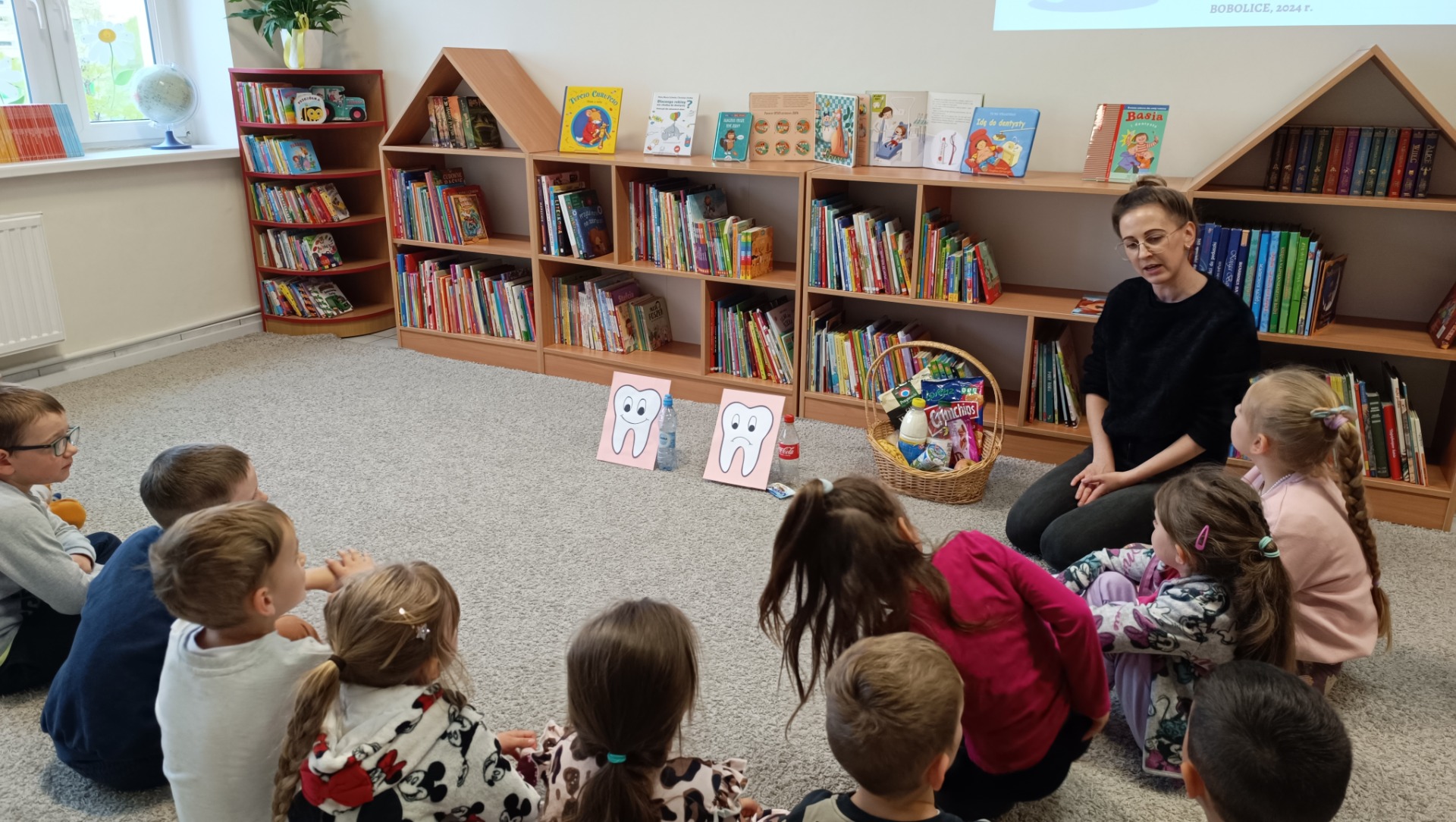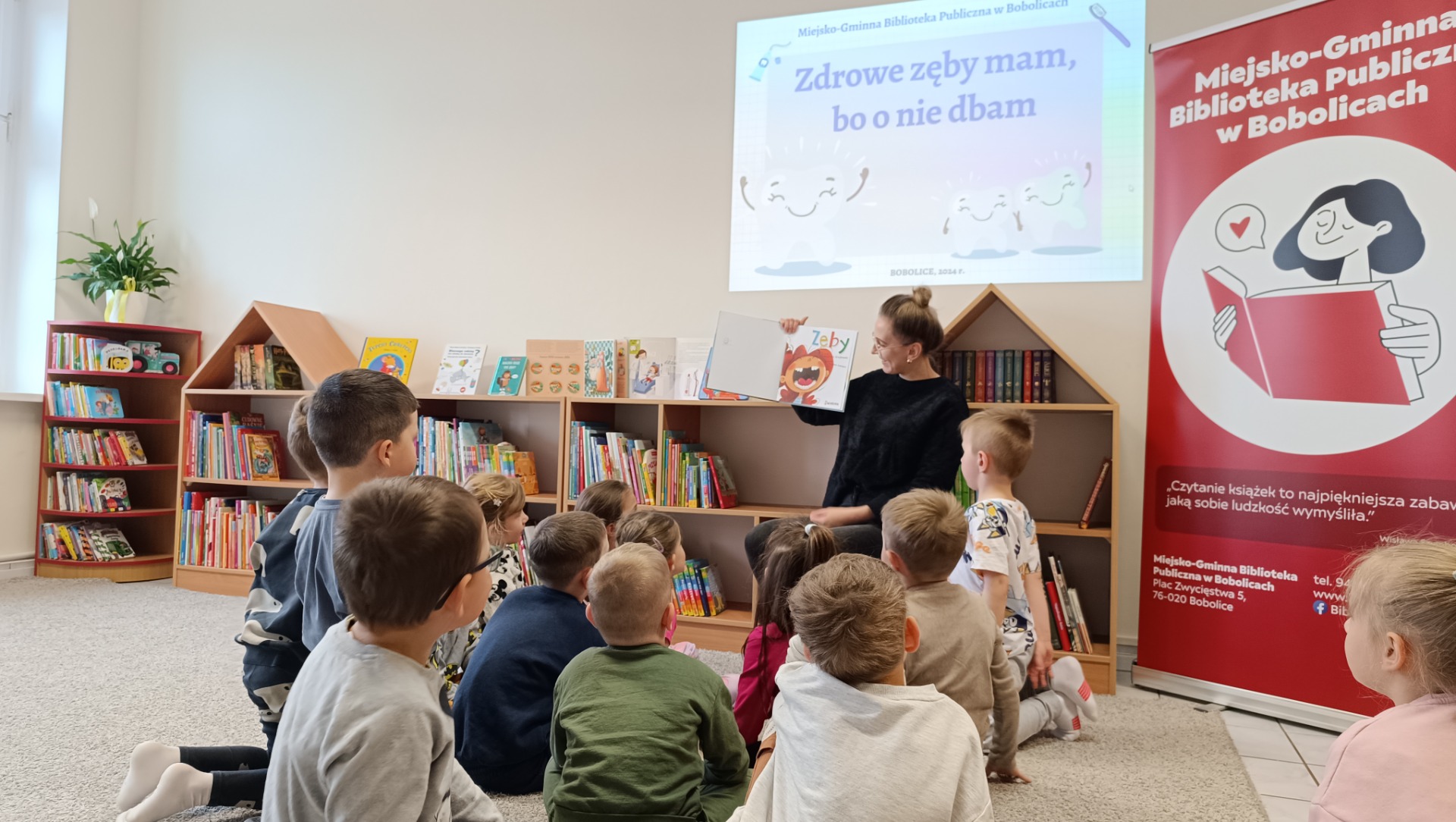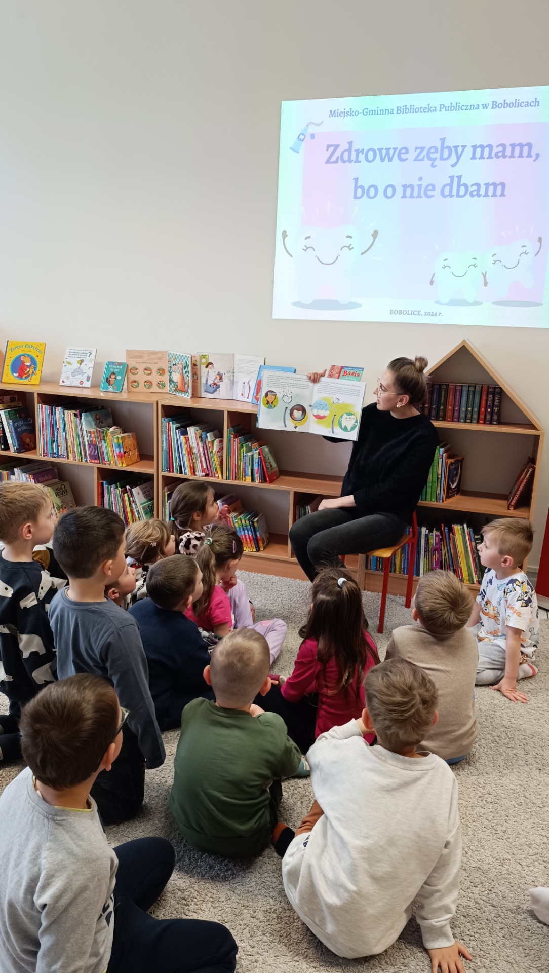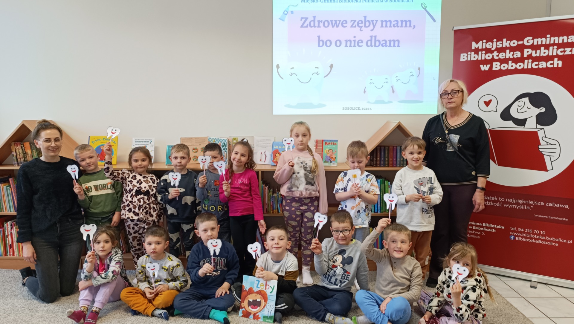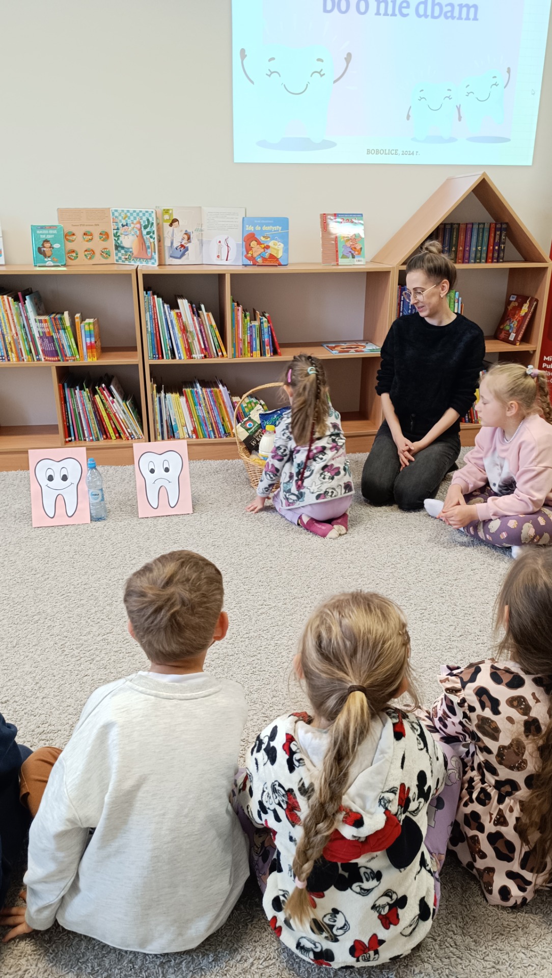 W dniu dzisiejszym naszą bibliotekę odwiedziły ,,Zabki" z Przedszkole "Leśne Skrzaty" w Bobolicach. Uczestniczyły w zajęciach pod hasłem: „Zdrowe zęby mam, bo o nie dbam”.