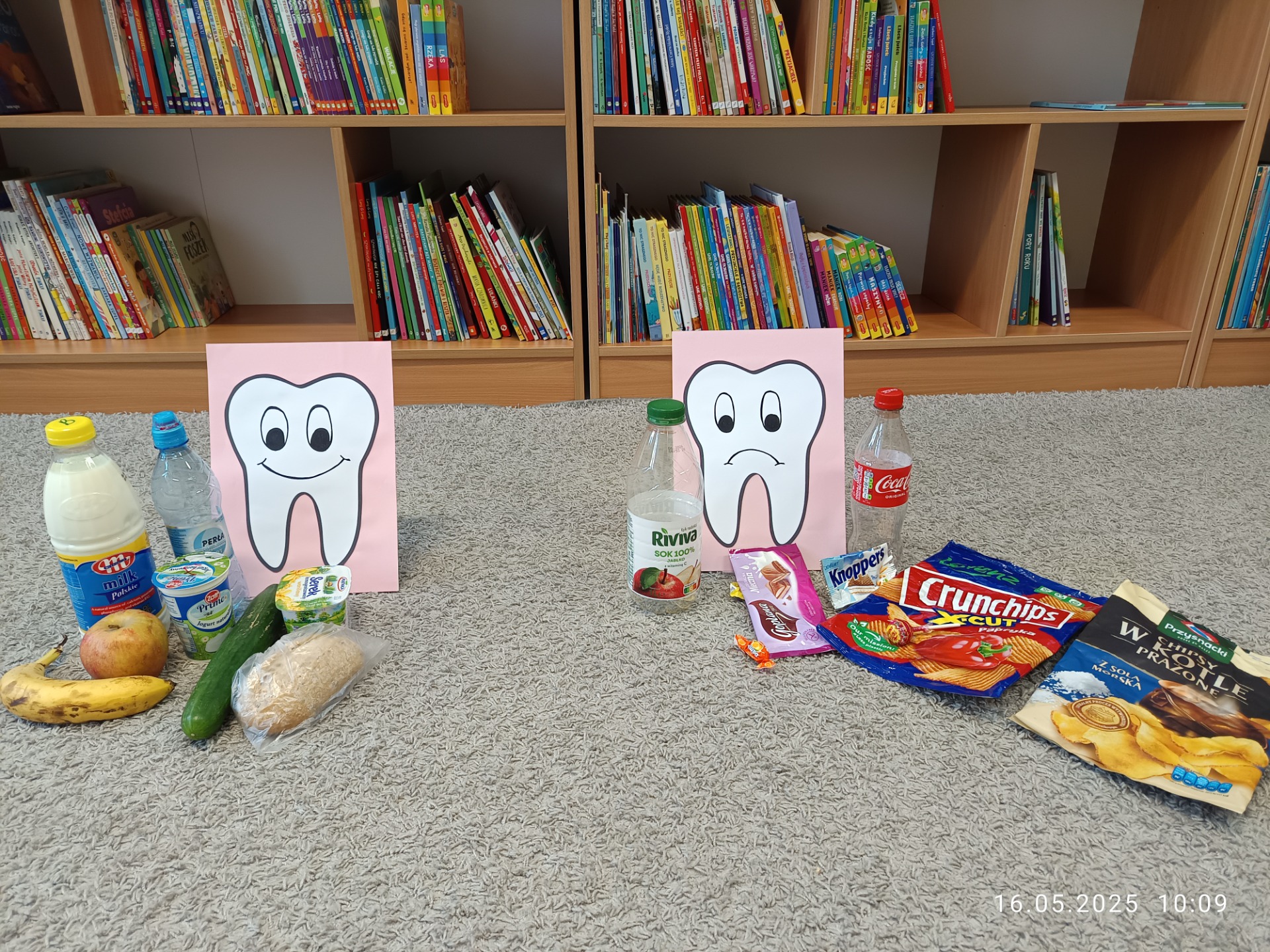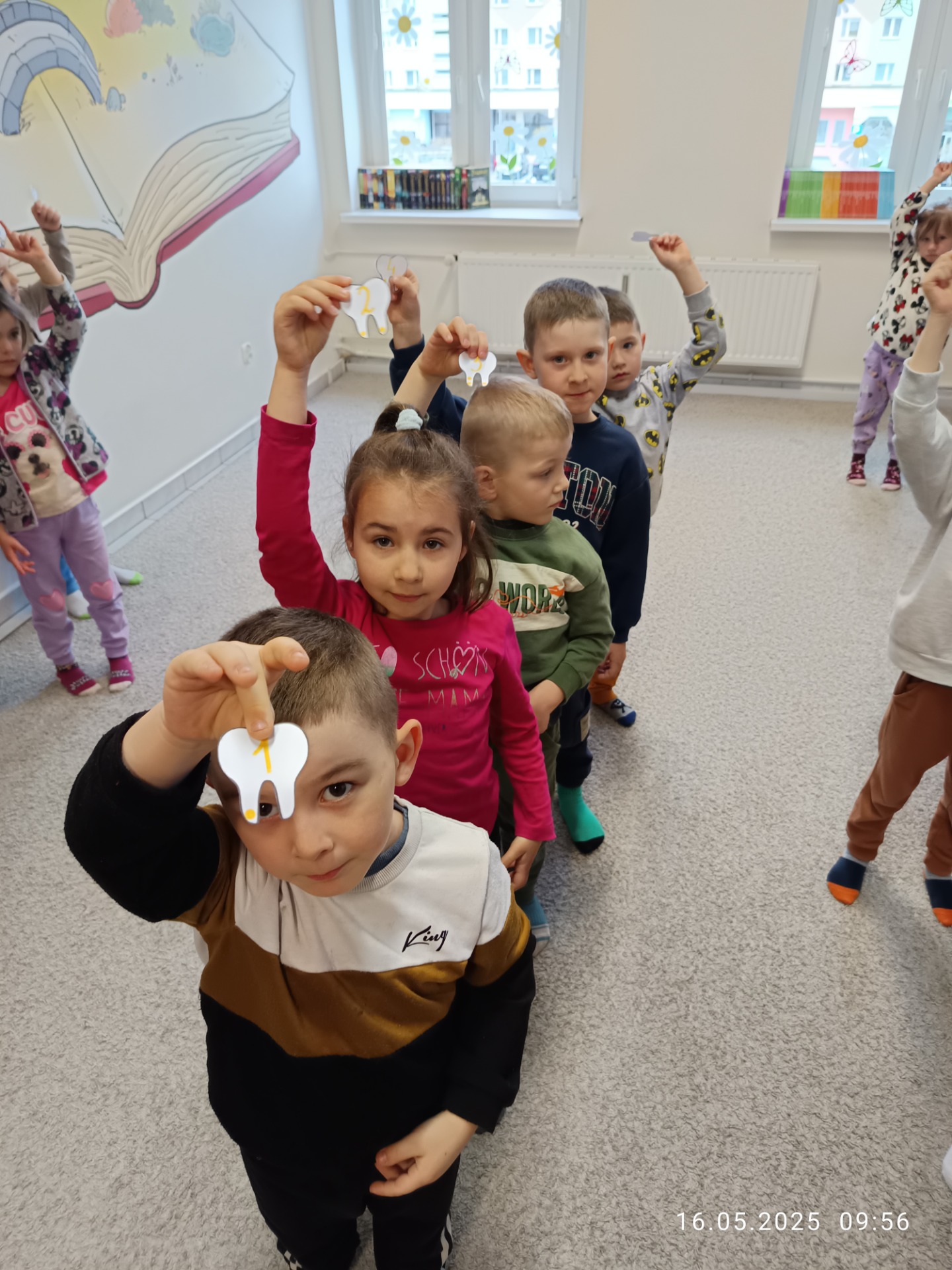 Dzieci wysłuchały książkę pt. ,,Zęby". To świetne opowiadanie zawierające odpowiedzi na wszystkie pytania dotyczące dbania o zęby. Ponadto przedszkolaki brały aktywny udział w rozmowie, w zabawach ruchowych, rozwiązywali zagadki, klasyfikowali produkty zdrowe i niezdrowe dla zębów oraz wykonali uśmiechnięte ząbki.