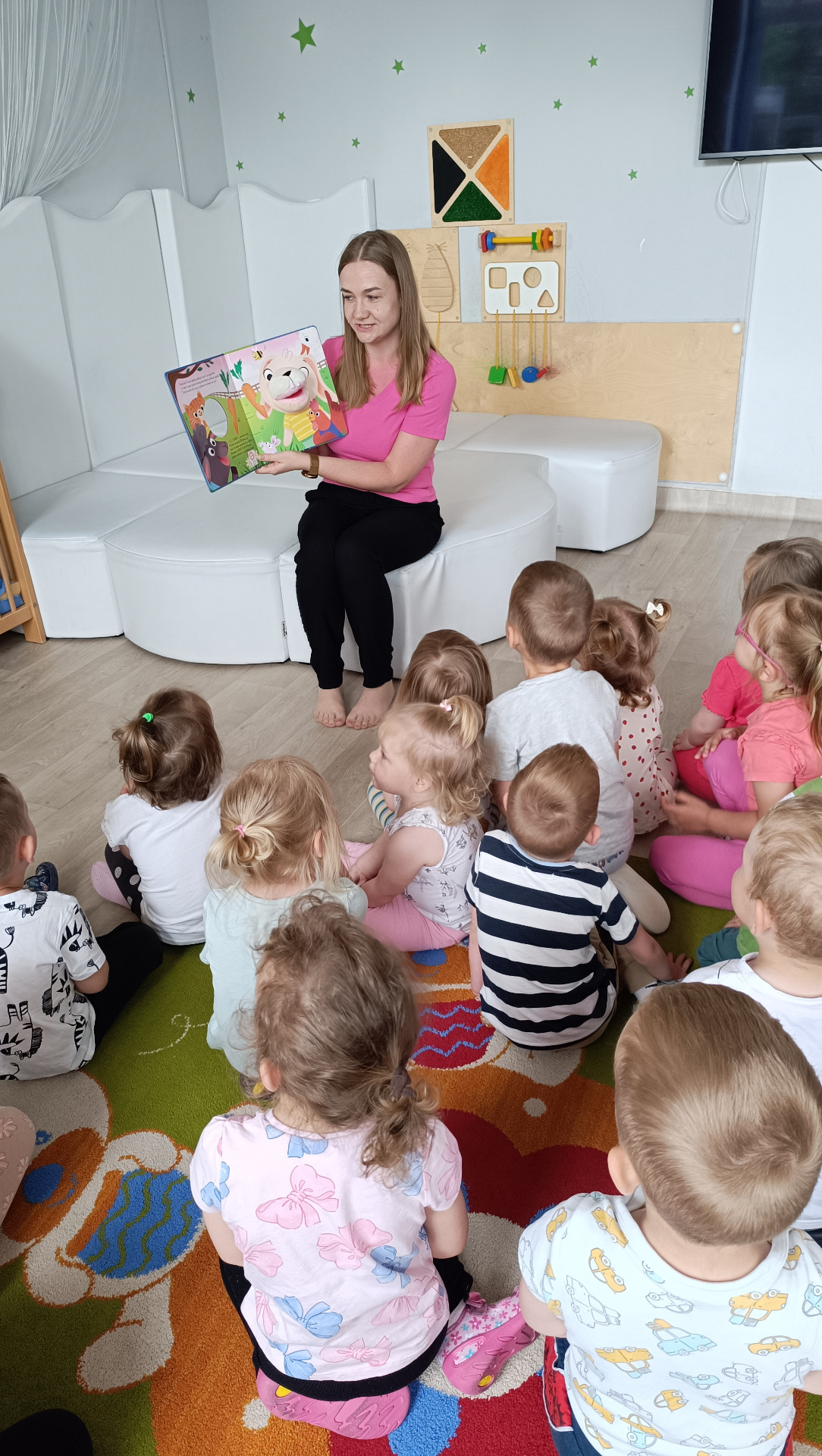 Dzięki wykorzystaniu pacynki, historia stała się jeszcze bardziej angażująca, a dzieci z zaciekawieniem śledziły losy bohaterów książeczki. Spotkanie zakończyło się wspólną zabawą przy dobrze znanej i lubianej piosence „Chu Chu Ua”, podczas której nie zabrakło śmiechu, ruchu i radosnych okrzyków.