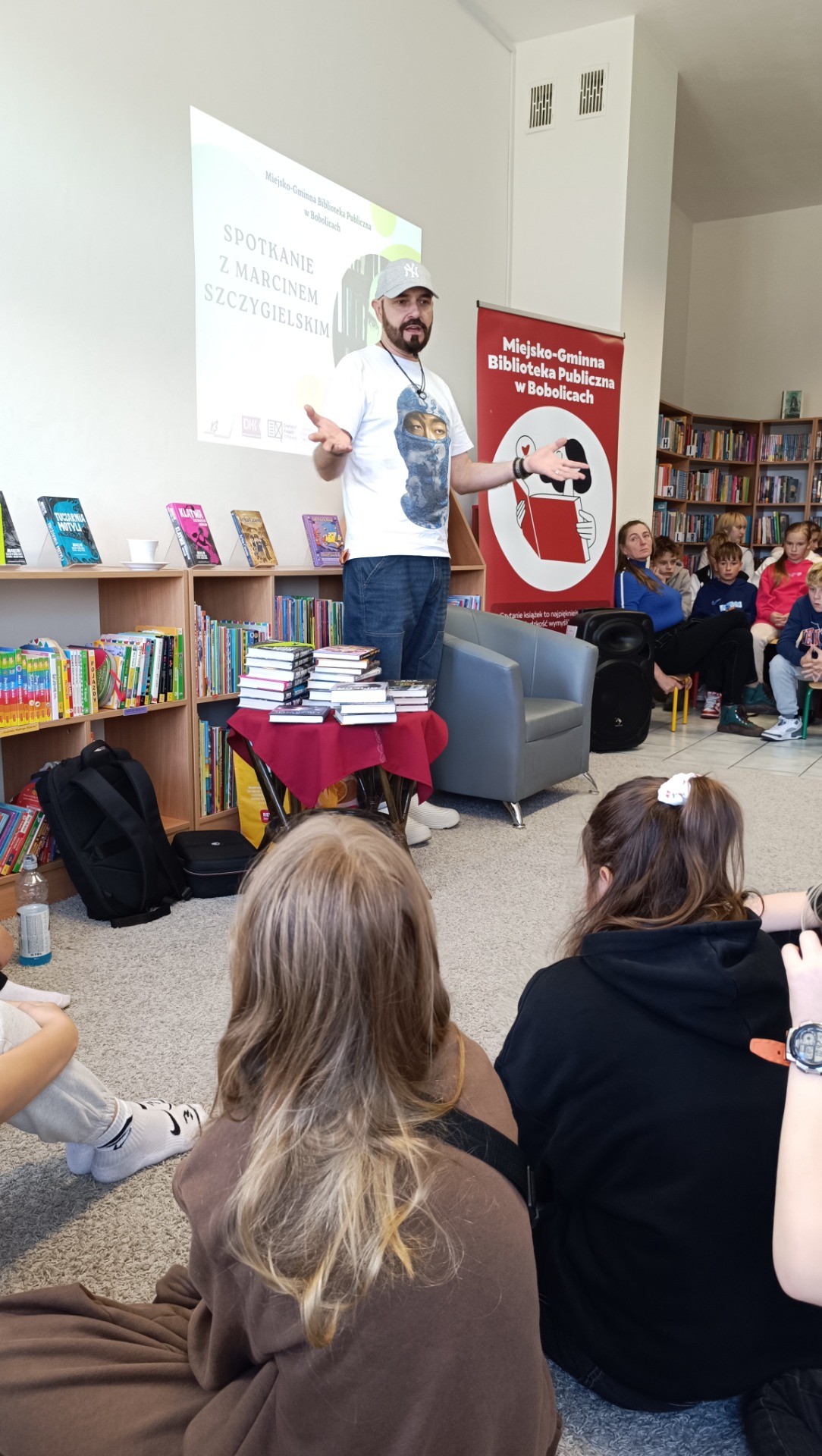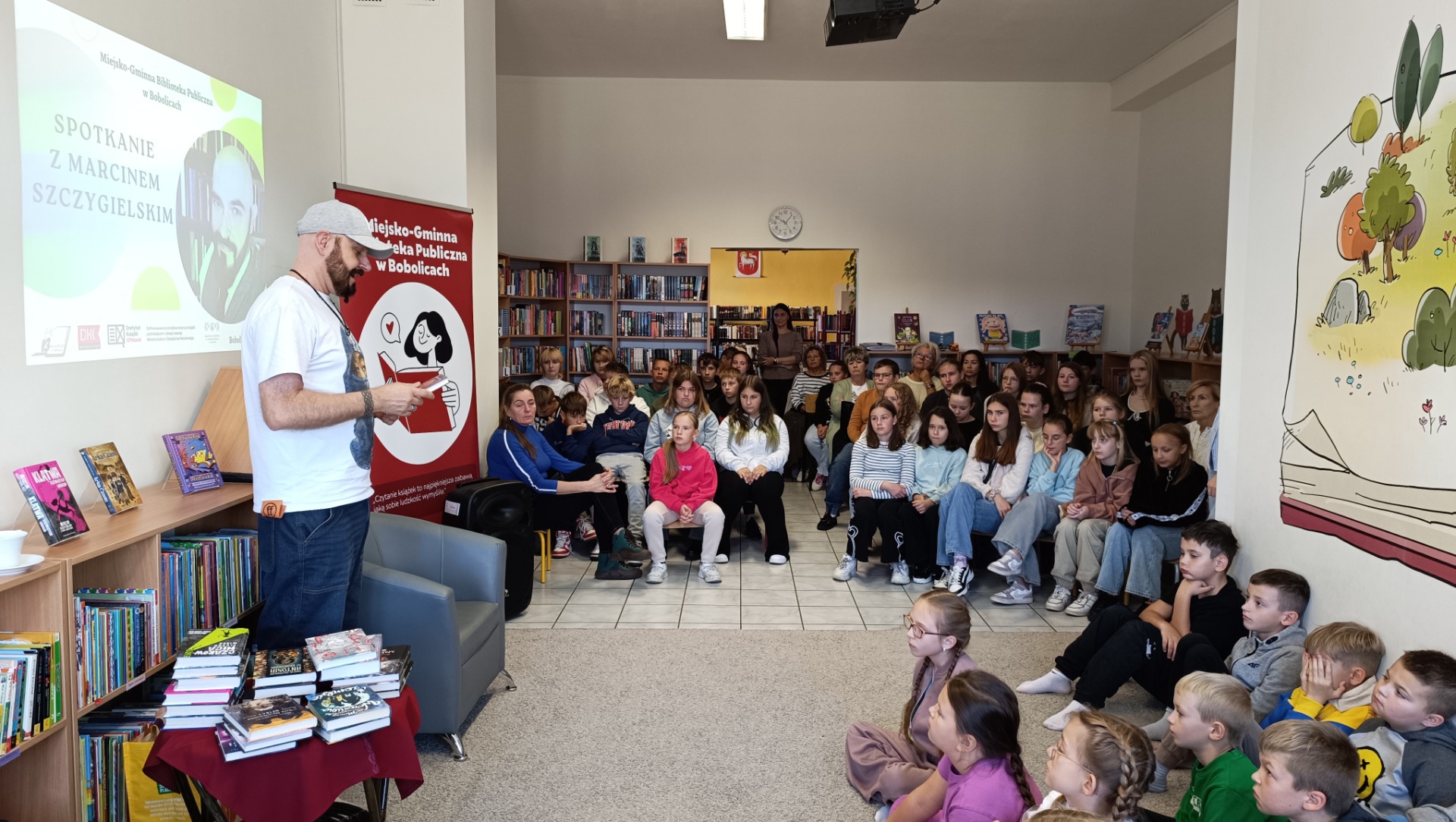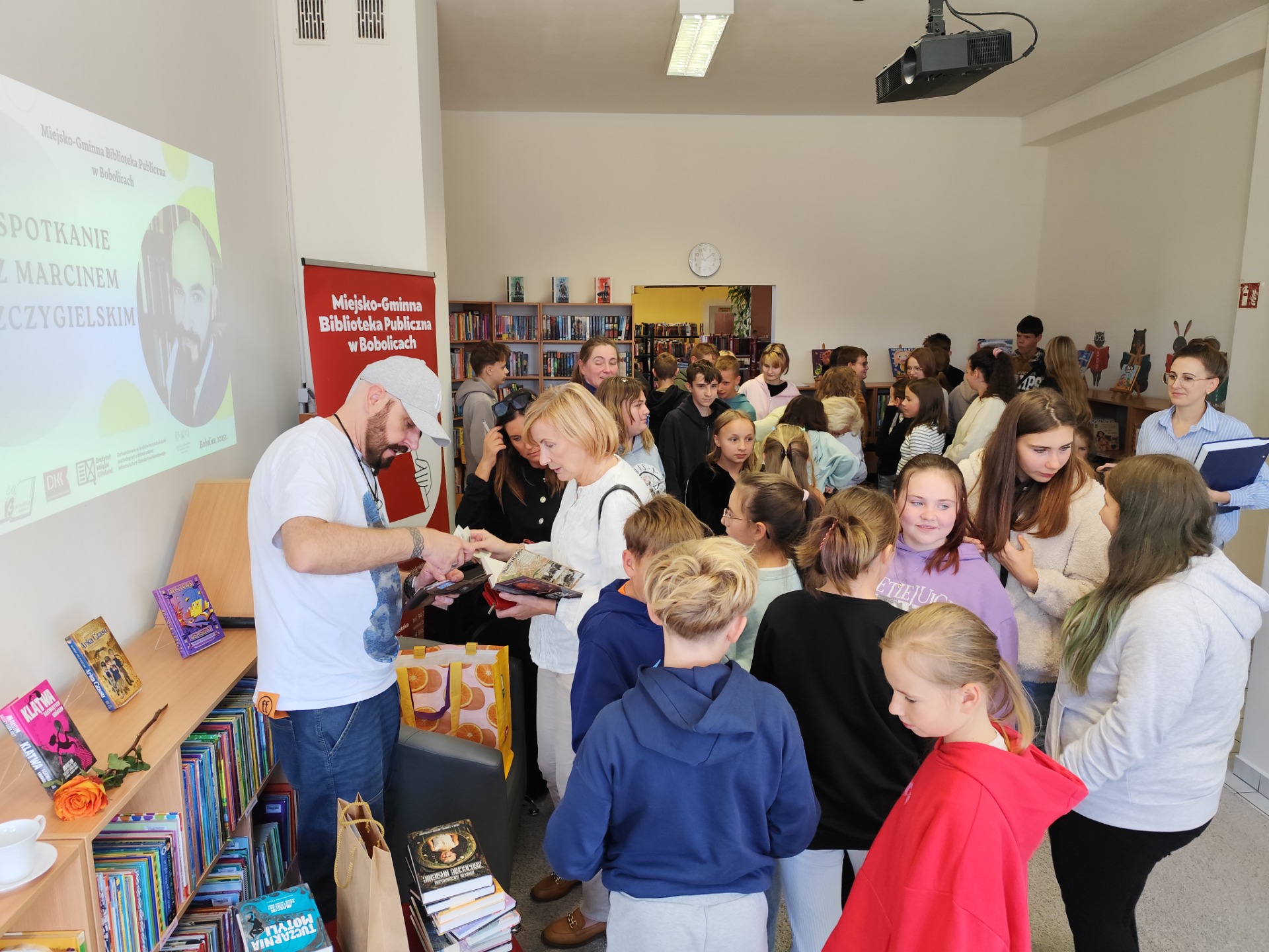 Sala biblioteki szybko wypełniła się słuchaczami ciekawymi twórczości gościa. Marcin Szczygielski opowiadał o swoich inspiracjach, drodze twórczej i kulisach powstawania książek. Autor sam podkreślił, że literatura dla młodszych czytelników daje mu ogromną satysfakcję i pozwala rozmawiać z dziećmi o sprawach ważnych i trudnych w sposób przystępny, pełen humoru i wyobraźni. Nie zabrakło anegdot związanych z jego najpopularniejszymi tytułami.