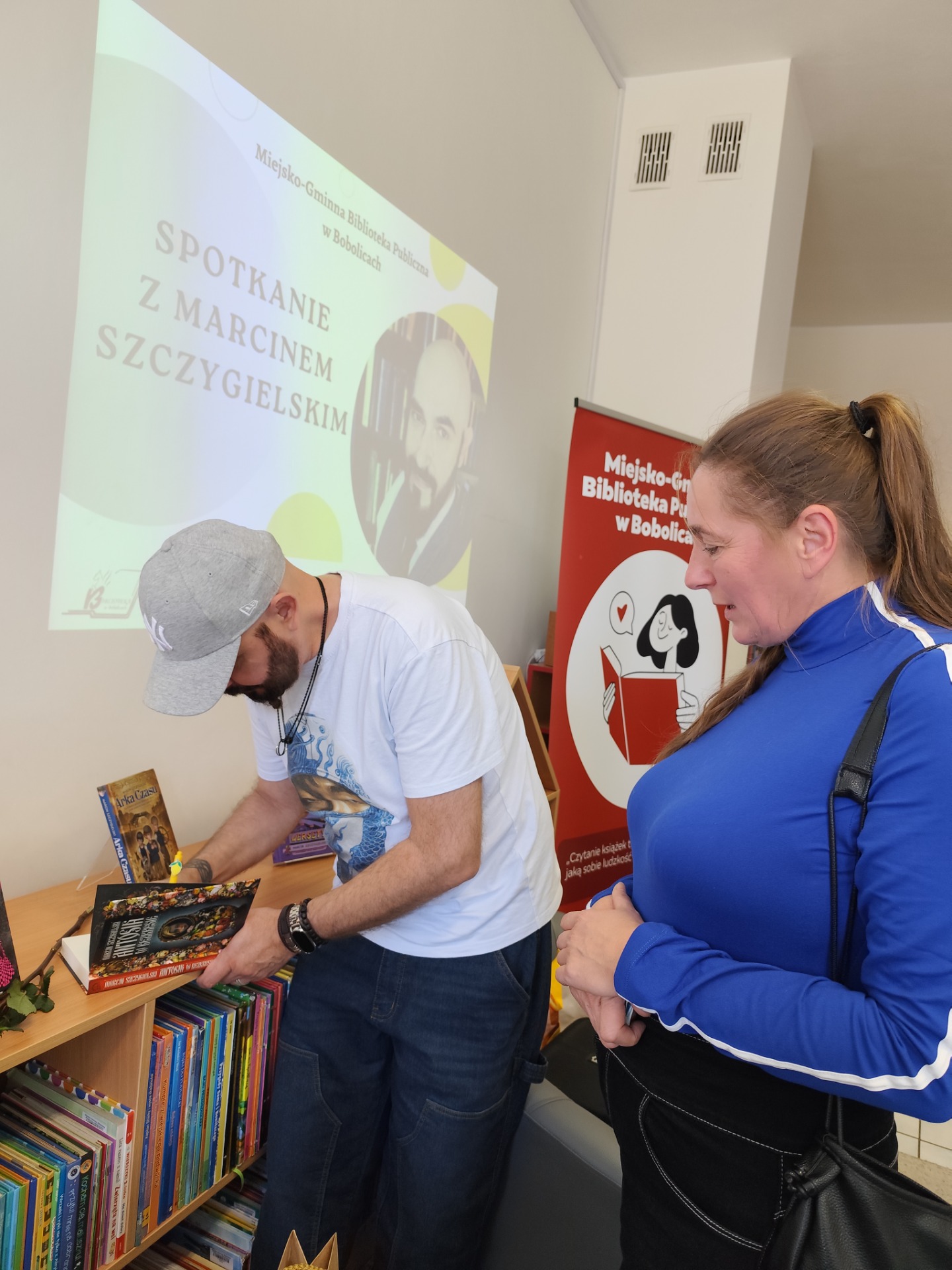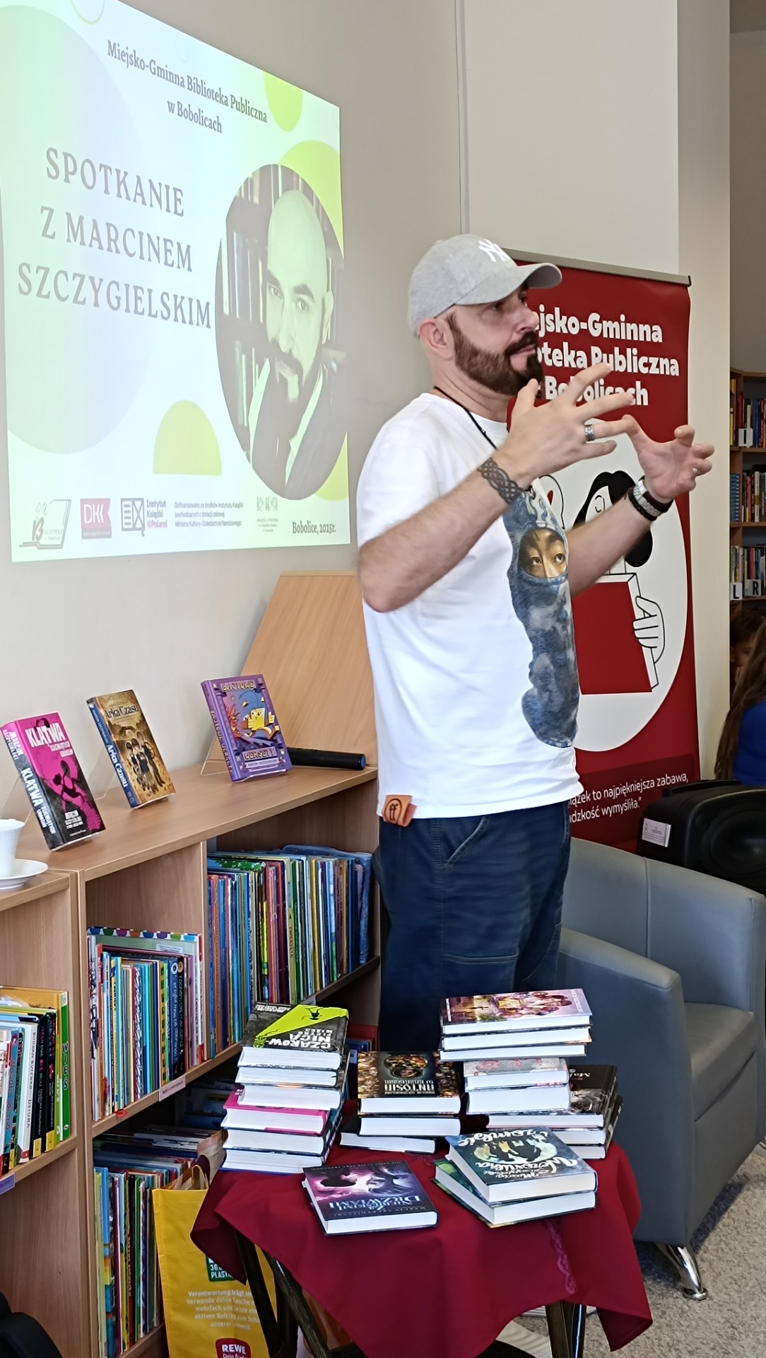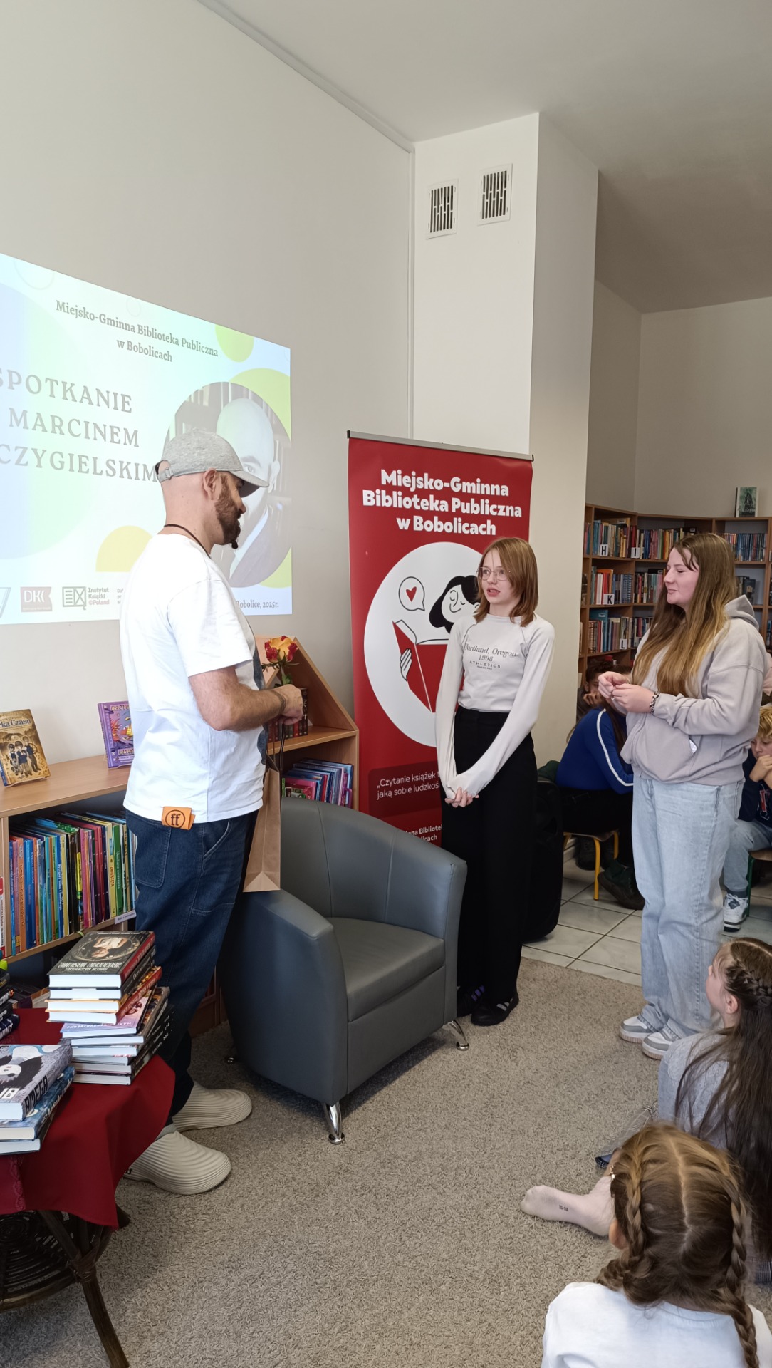 Sala biblioteki szybko wypełniła się słuchaczami ciekawymi twórczości gościa. Marcin Szczygielski opowiadał o swoich inspiracjach, drodze twórczej i kulisach powstawania książek. Autor sam podkreślił, że literatura dla młodszych czytelników daje mu ogromną satysfakcję i pozwala rozmawiać z dziećmi o sprawach ważnych i trudnych w sposób przystępny, pełen humoru i wyobraźni. Nie zabrakło anegdot związanych z jego najpopularniejszymi tytułami.