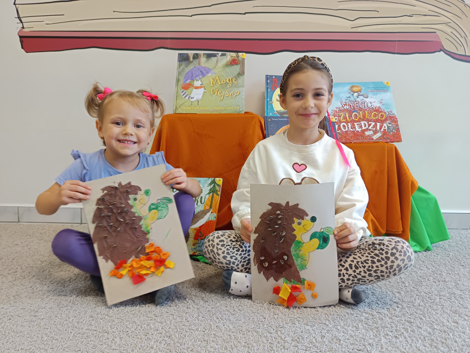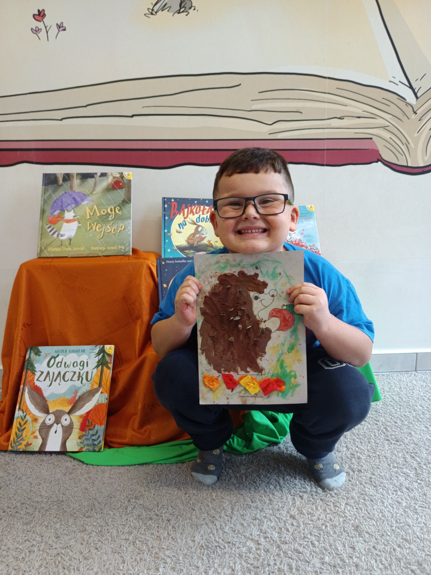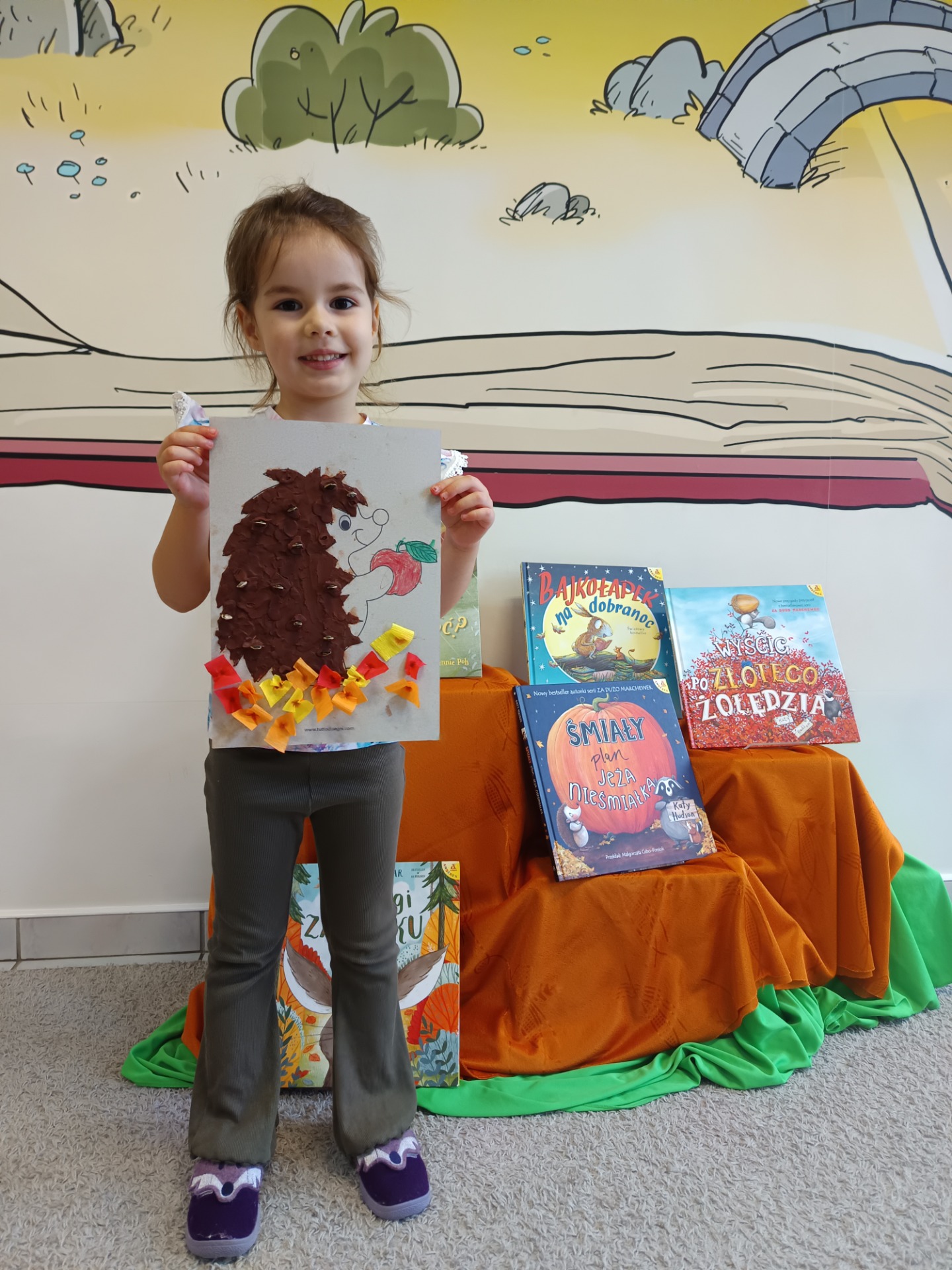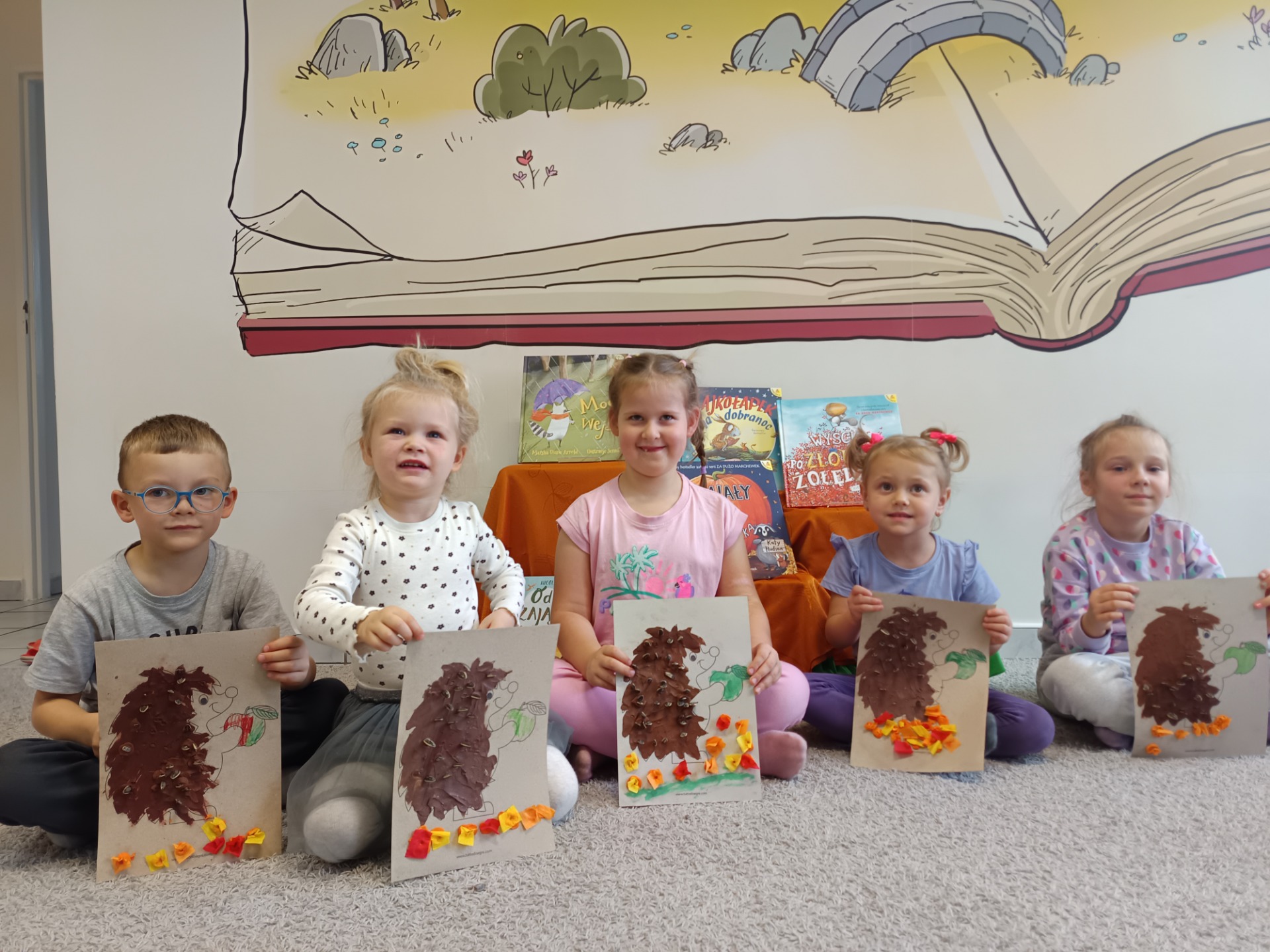 pt. ,,Wielka przygoda jeżyka". Bohater wyruszył w swoją pierwszą samodzielną wyprawę, podczas której odkrywał świat, stawiał czoła przeciwnościom i uczył się odwagi, samodzielności oraz radzenia sobie z wyzwaniami. Bawiliśmy się przy piosence ,,Idzie jeż", a w drugiej części spotkania dzieci wykonały jesiennego jeżyka