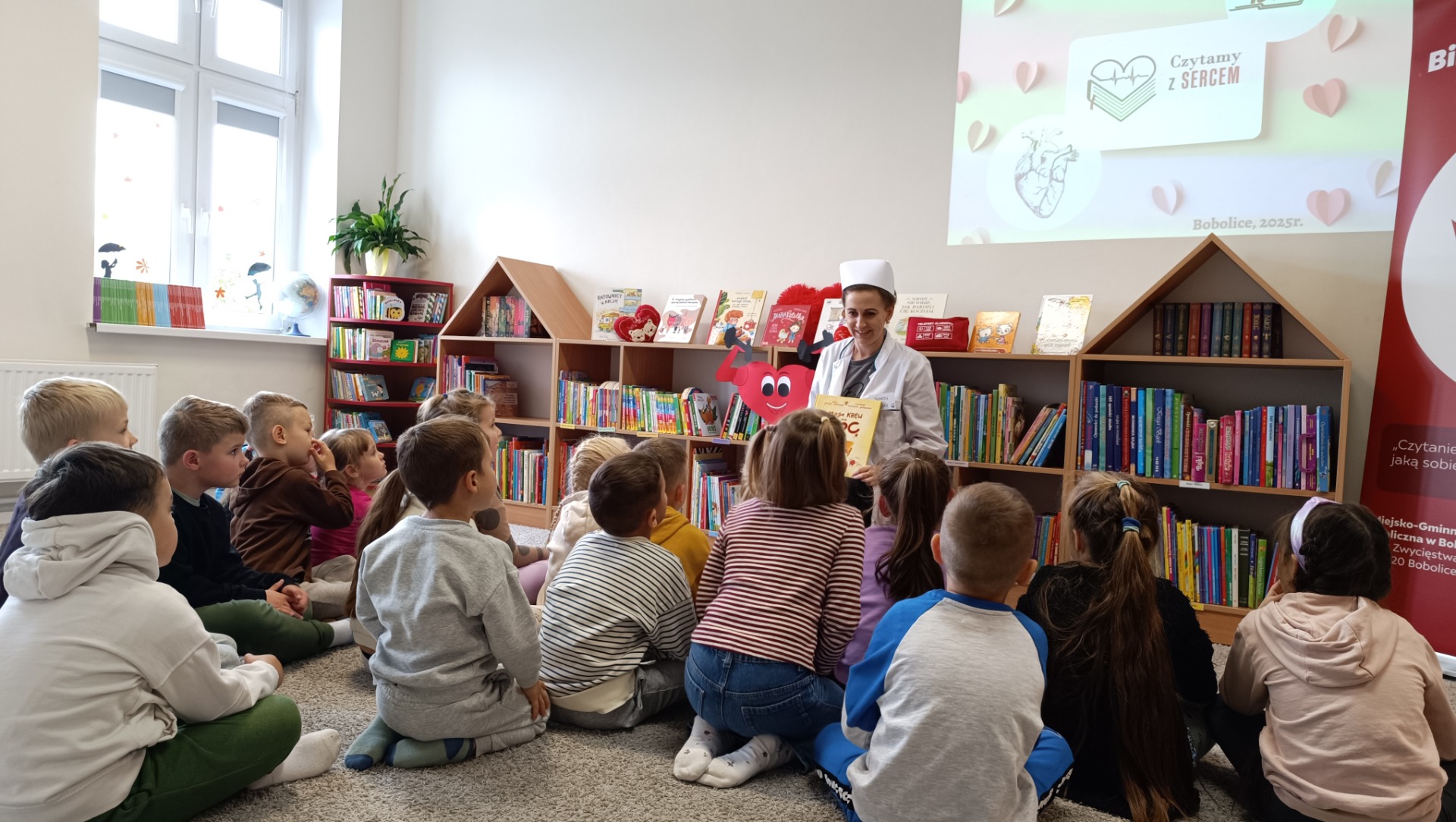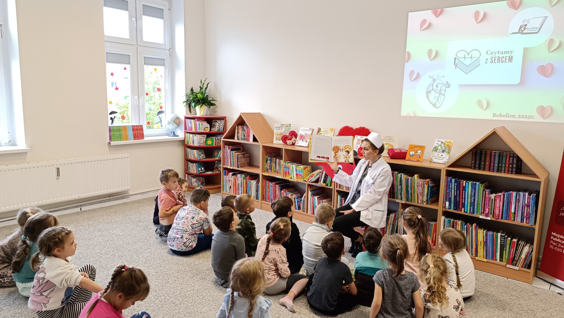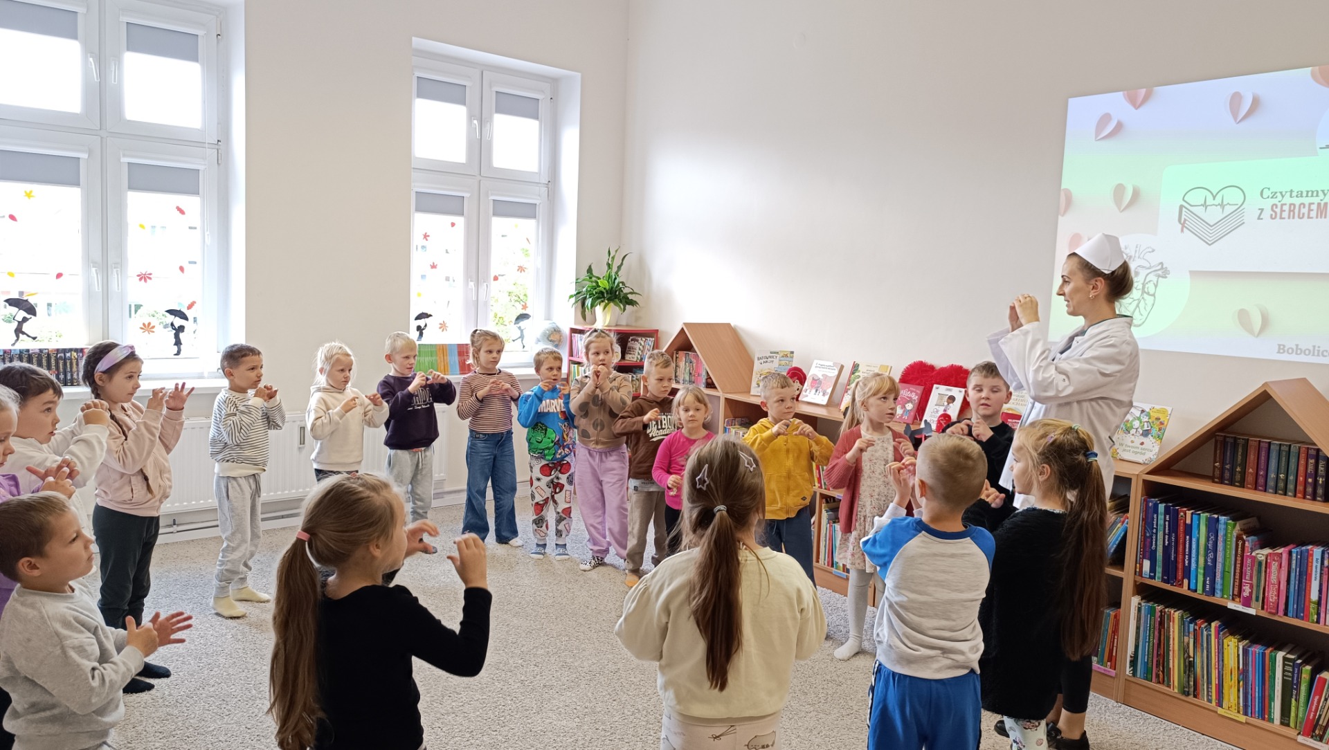 Podczas dzisiejszego spotkania pn. ,,Poranki - Czytanki" również wzięliśmy udział w V Edycji Ogólnopolskiej Akcji Edukacyjnej Czytamy z Sercem, która łączy miłość do książek z troską o zdrowie.