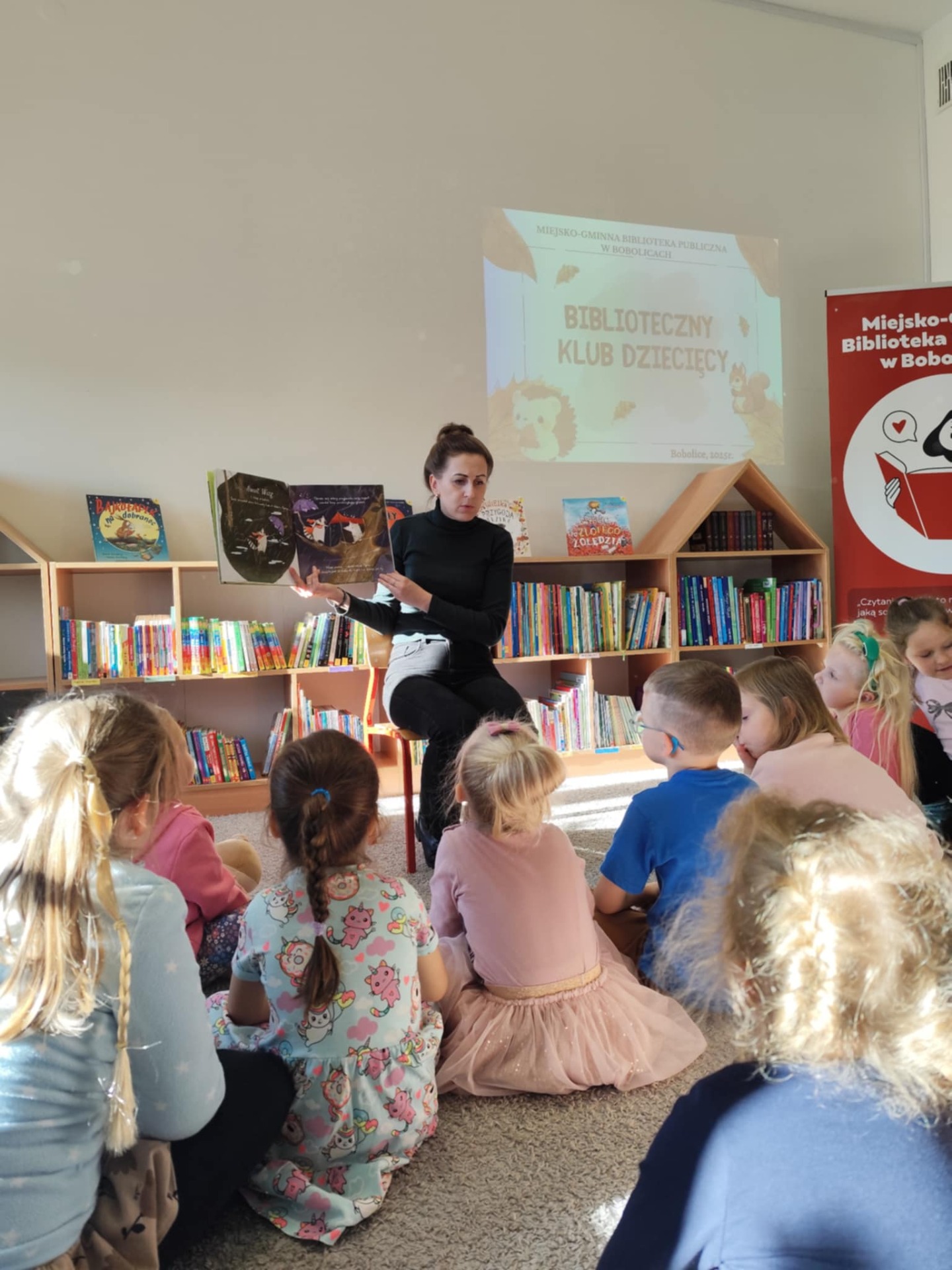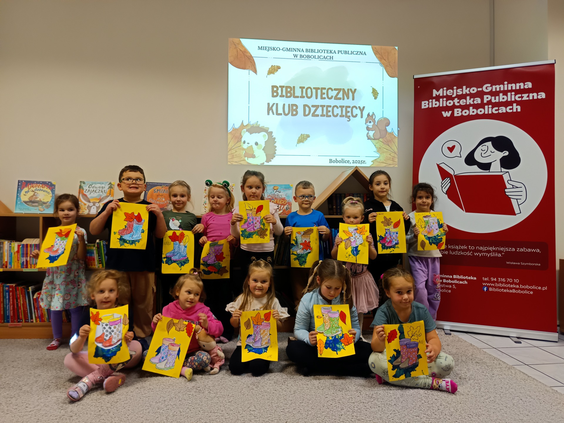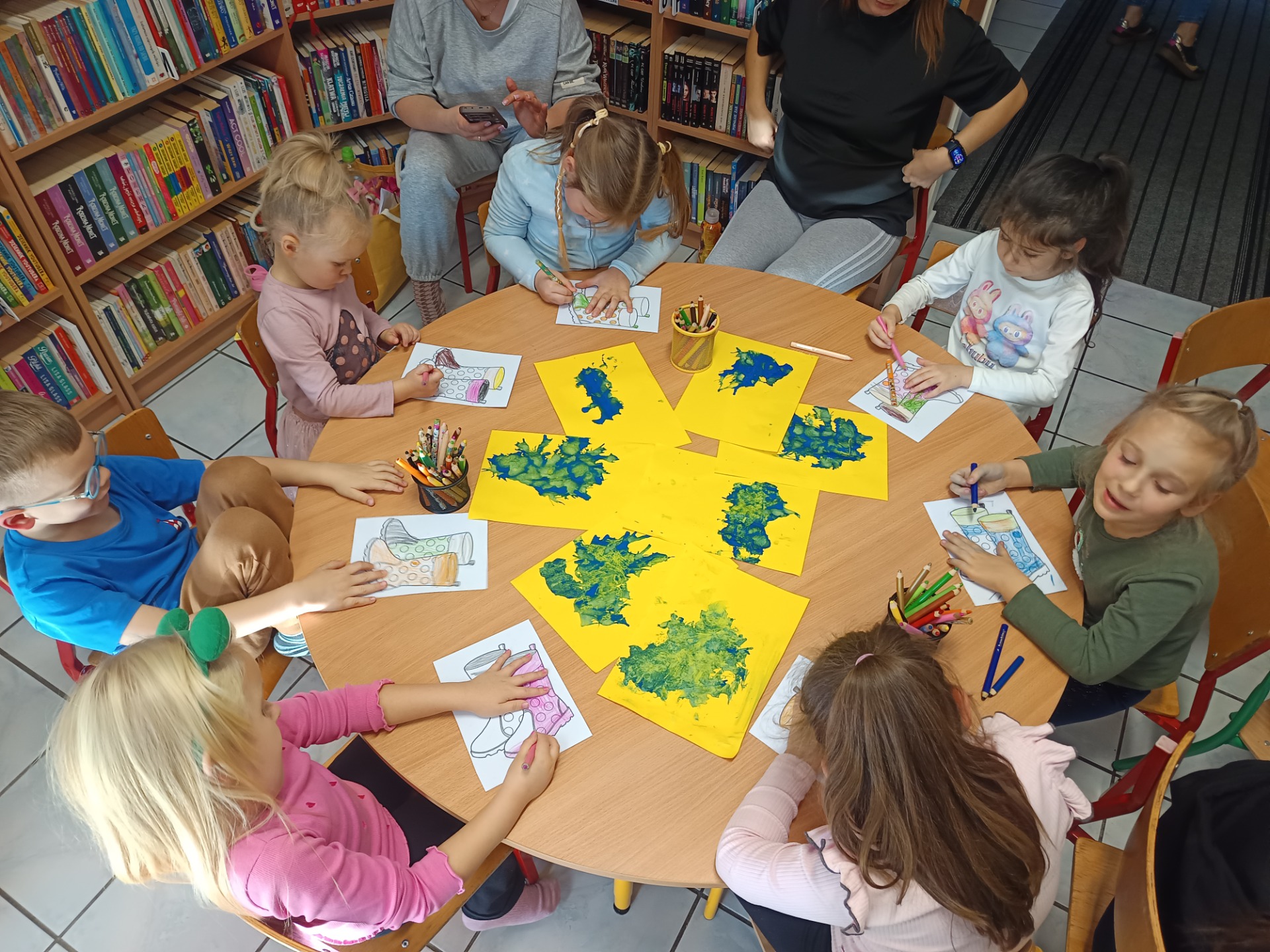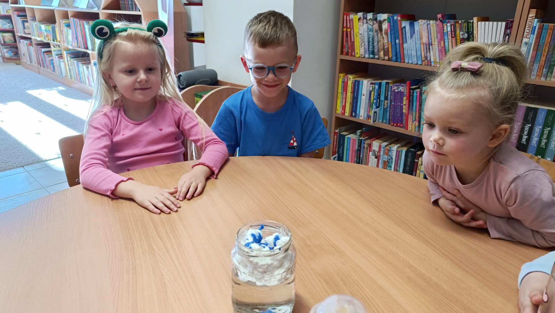 Podczas kolejnego spotkania Bibliotecznego Klubu Dziecięcego mali uczestnicy przenieśli się w świat jesiennej pogody. Na początku dzieci wysłuchały pełnej humoru i ciepła książki pt. „Mogę wejść?” – opowieści o empatii, przyjaźni i pomaganiu innym w potrzebie. Po literackiej części nadszedł czas na eksperyment – „Deszcz w słoiku”. Dzieci z zaciekawieniem obserwowały, jak powstają chmury i jak z nich spada deszcz. Nie zabrakło również zabawy muzycznej „Deszczyk pada, deszczyk pada”, podczas której maluchy rytmicznie pokazywały zjawiska pogodowe przy dźwiękach jesiennej piosenki.