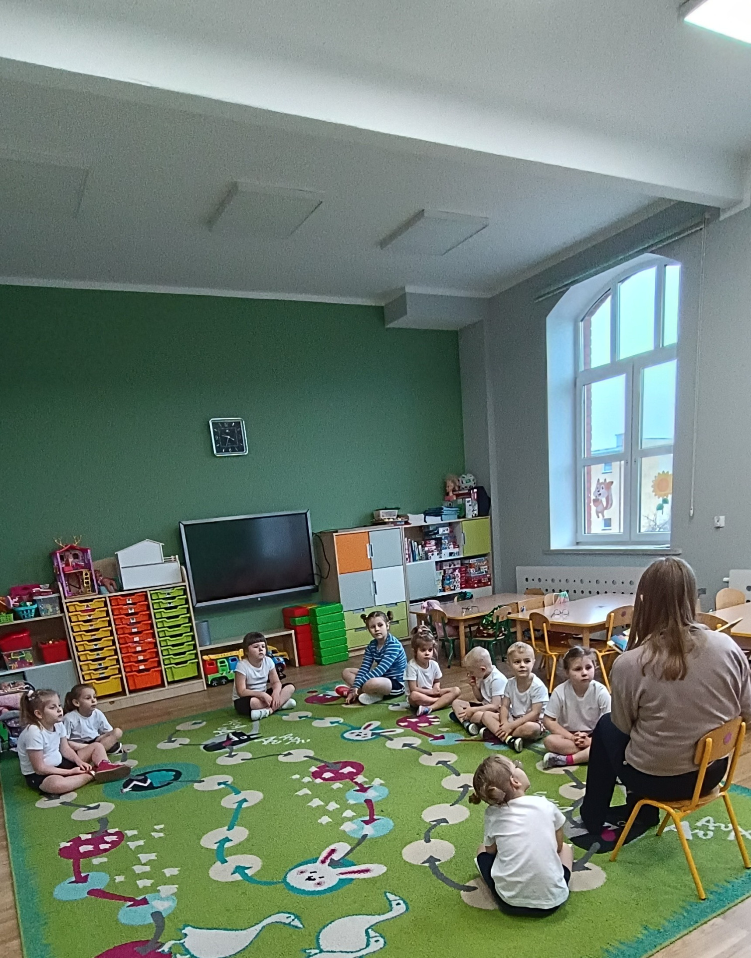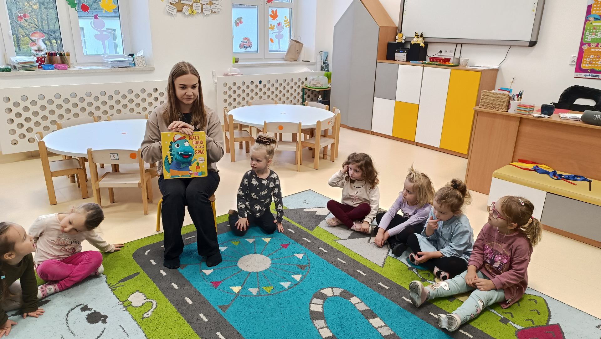 Podczas dzisiejszego spotkania w ramach akcji czytelniczej "Poranki-Czytanki" dzieci wysłuchały opowiadania „Mały Dinuś nie może zasnąć” – uroczej książki z pacynką, która wywołała wiele radości i uśmiechów. Historia małego dinozaura, który próbuje zasnąć, stała się świetnym pretekstem do rozmów o wieczornych rytuałach i sposobach na dobry sen.