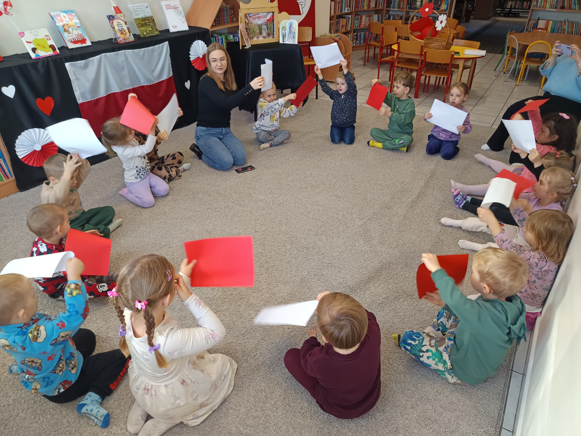 Sówki wysłuchały opowieści „Niepodległa – 11 listopada” przedstawionej w formie teatrzyku Kamishibai , a następnie wzięły udział w zabawach edukacyjnych i ruchowych, które pomogły im poznać i utrwalić polskie symbole narodowe .