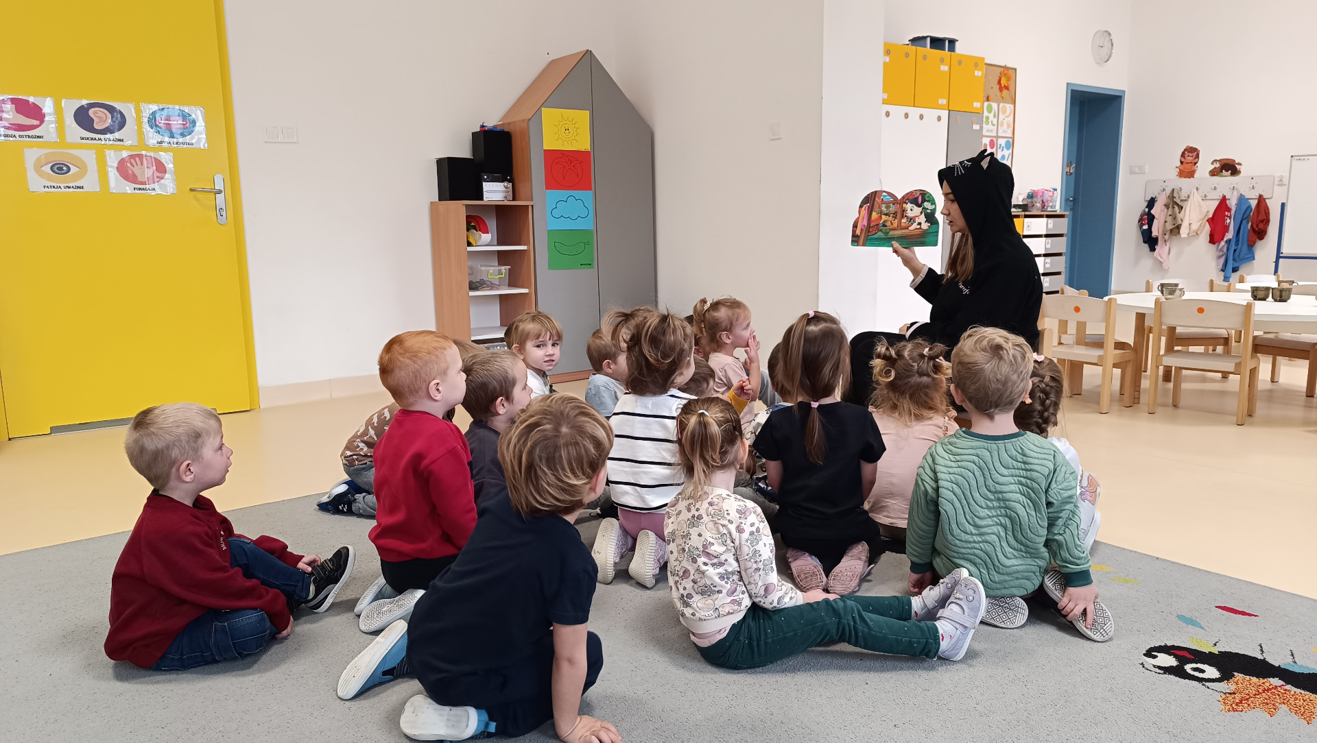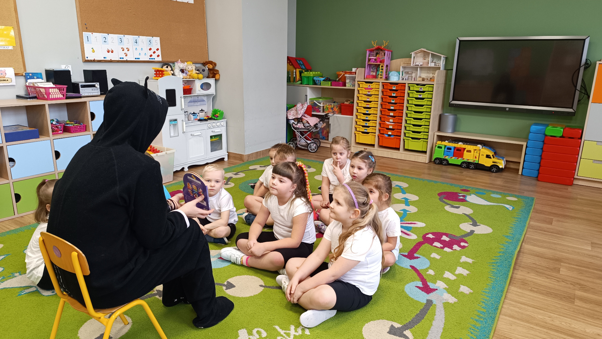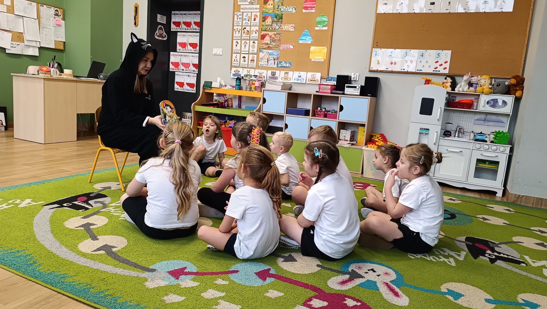 Maluchy wysłuchały wzruszającego opowiadania „Nieśmiały kotek”-ciepłą, pełną uroku opowieść o małym kotku, który krok po kroku przełamuje swoją nieśmiałość i odkrywa, że świat wcale nie jest taki straszny. To historia, która uczy odwagi, przyjaźni i wiary w siebie. Przedszkolaki świetnie bawiły się również podczas muzycznej zabawy „Pięć małych kotków”.