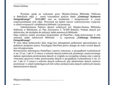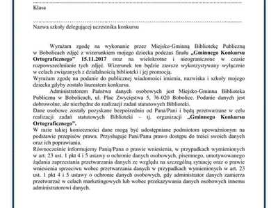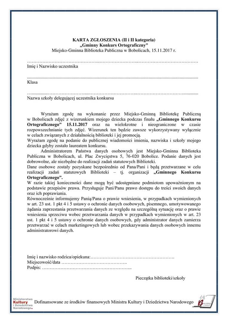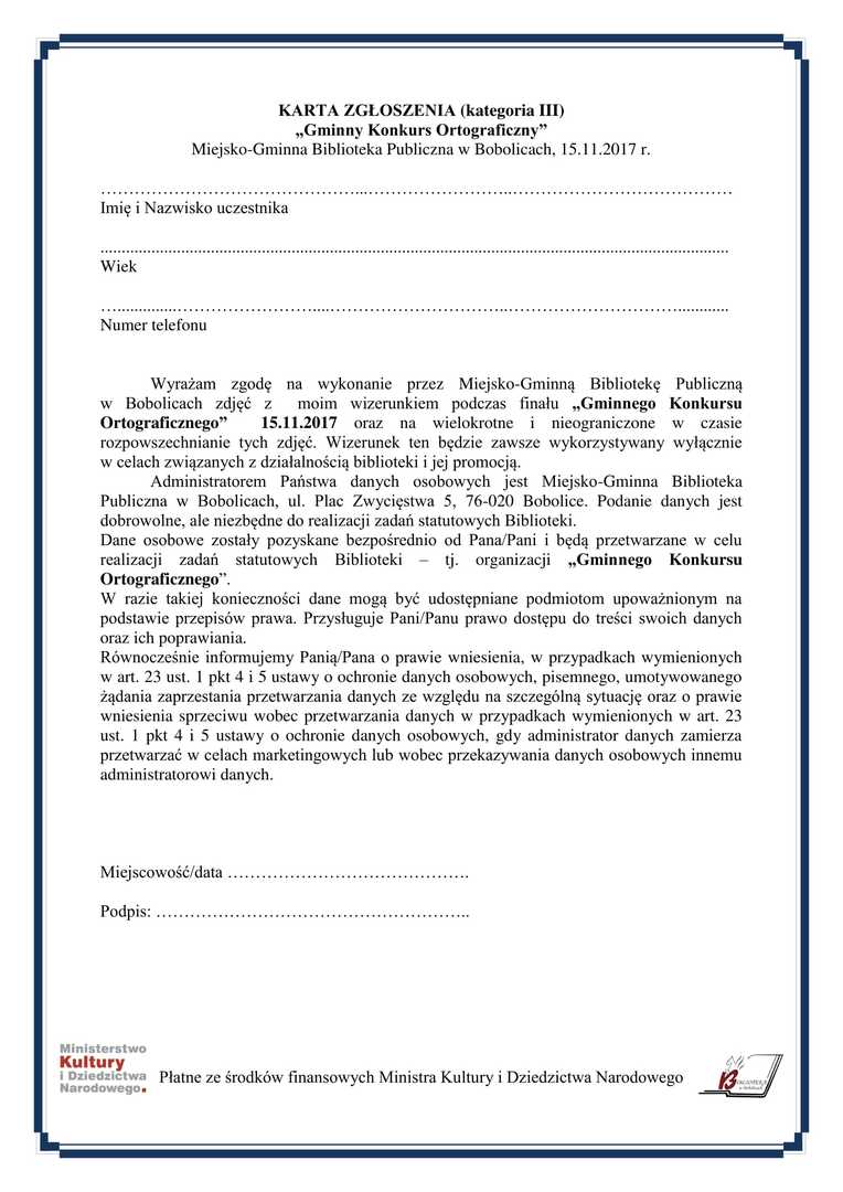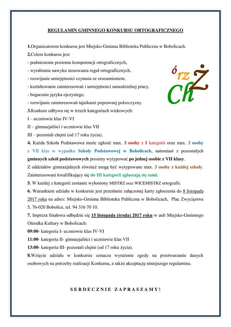 Zapraszamy dzieci, młodzież i dorosłych do udziału w „Gminnym Konkursie Ortograficznym”, który odbędzie się 15.11.2017 r. (środa). Dofinansowano ze środków Ministra Kultury i Dziedzictwa Narodowego. Regulamin konkursu i karty zgłoszenia dostępne w galerii.