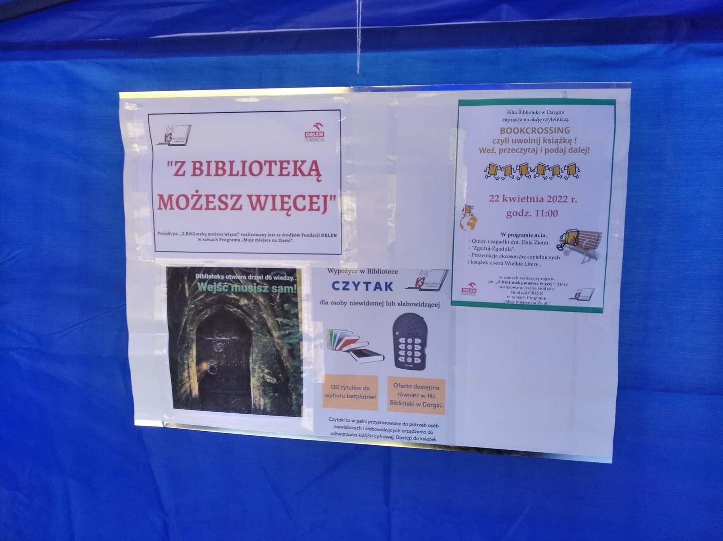 ”Zainwestuj w naszą planetę” to hasło Dnia Ziemi. W Dargini odbyła się akcja czytelnicza ,,Bookcrossing, czyli uwolnij książkę! Weź, przeczytaj i podaj dalej". Rozstawiono namiot, zaprezentowano akcesoria czytelnicze i książki z serii Wielkie Litery. Były quizy i zagadki dotyczące Dnia Ziemi. W akcji wzięli także udział uczestnicy zajęć pn. „Czytać każdy może".