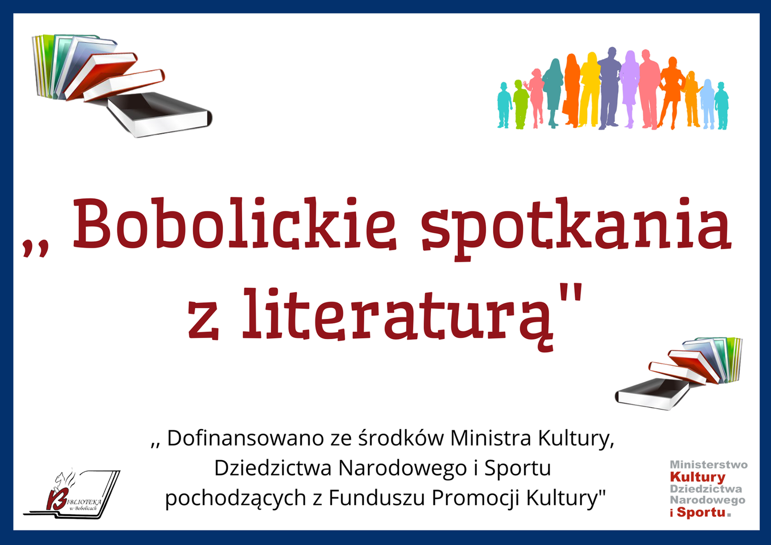 Działanie dofinansowano ze środków Ministra Kultury, Dziedzictwa Narodowego i Sportu pochodzących z Funduszu Promocji Kultury uzyskanych z dopłat ustanowionych w grach objętych monopolem państwa zgodnych z art.80 ust.1 ustawy z dnia 19 listopada 2009 r. o grach hazardowych" w ramach realizacji projektu pn. ,,Bobolickie spotkania z literaturą".