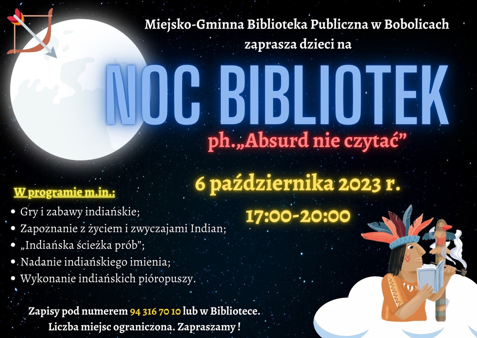 Zapraszamy dzieci na Noc Bibliotek w indiańskim stylu! Zapisy w Bibliotece i pod nr telefonu: 943167010.