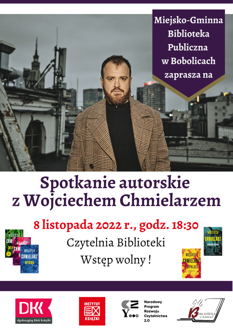 Zapraszamy wszystkich chętnych do udziału w spotkaniu autorskim z Wojciechem Chmielarzem autorem kryminałów, dziennikarzem, laureatem Nagrody Wielkiego Kalibru (2015 – za powieść „Przejęcie”) i Wielkiego Kalibru Czytelników (2019 – „Żmijowisko”), sześciokrotnie nominowanym do tej nagrody.